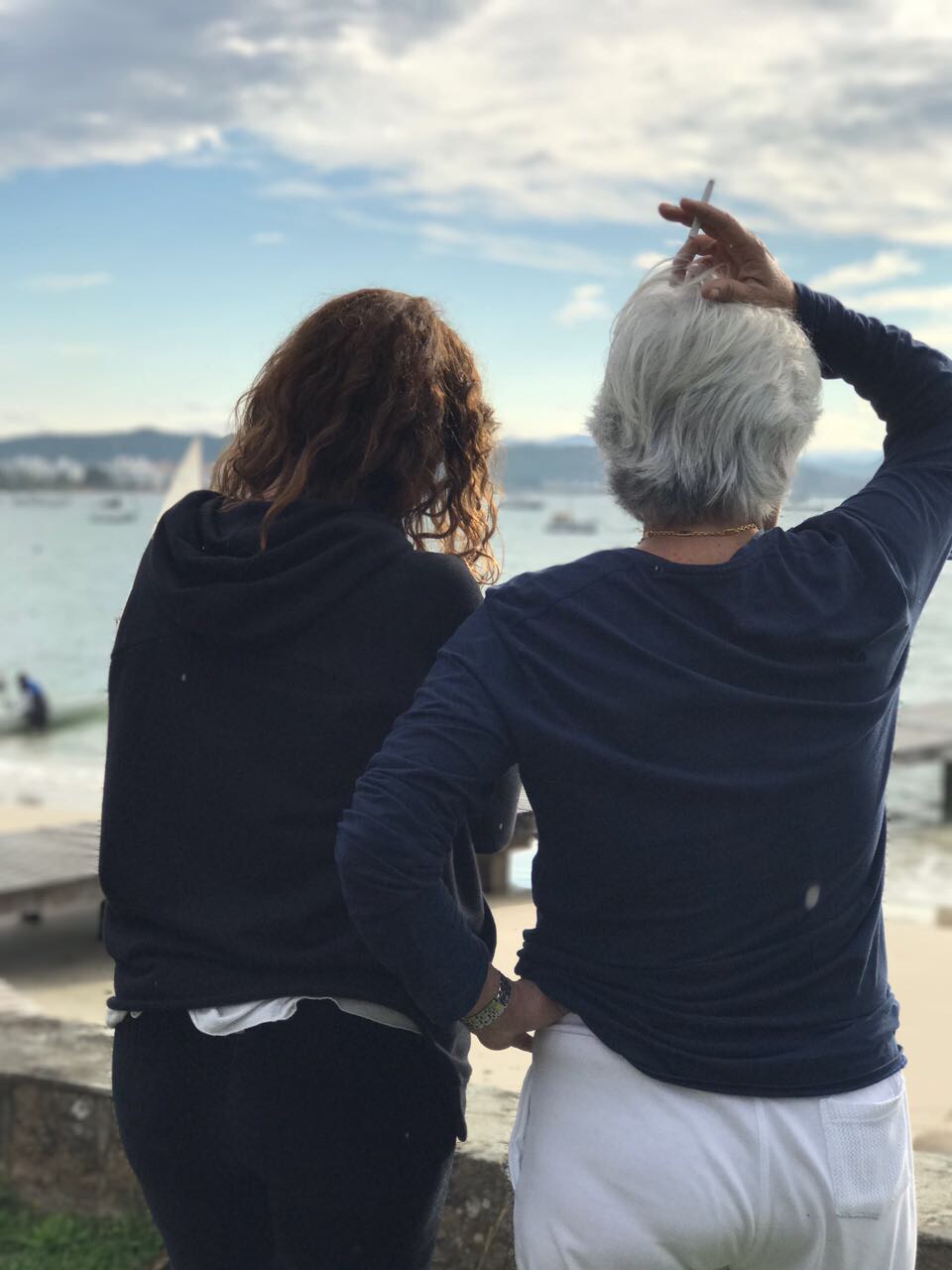 Vivi e Flavinha observando a chegada dos monotipos que estavam em regata