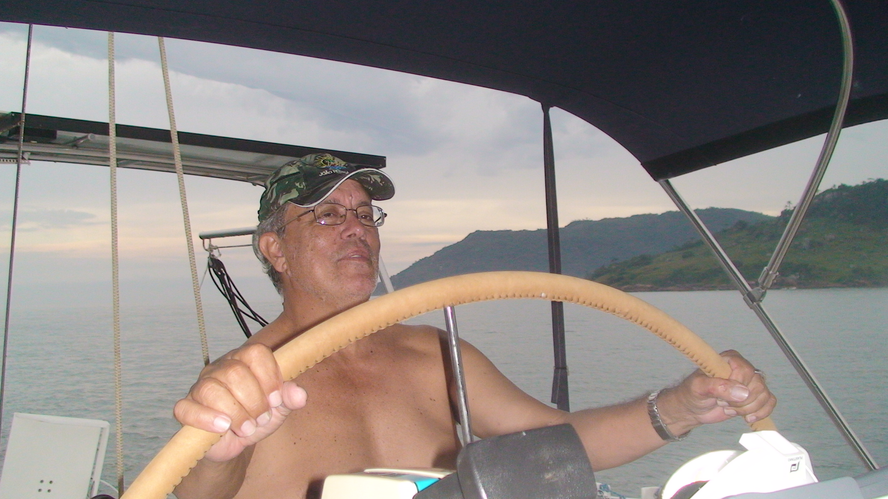 Mal chegamos a bordo, já quase no final da tarde, e ameaçou uma tempestade, daquelas de verão. Esperamos que a chuva passasse e fomos navegar, a motor, porque não há vento nenhum e o mar parece uma lagoa. O Dobs está numa alegria imensa e faceiro na roda de leme, pela primeira vez em sua vida.