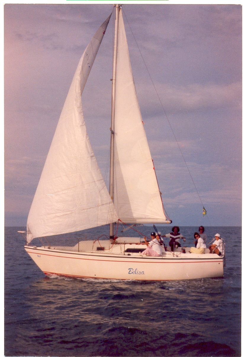 Dani está ali, sentadinha na popa do Belisa (nosso primeiro veleiro).