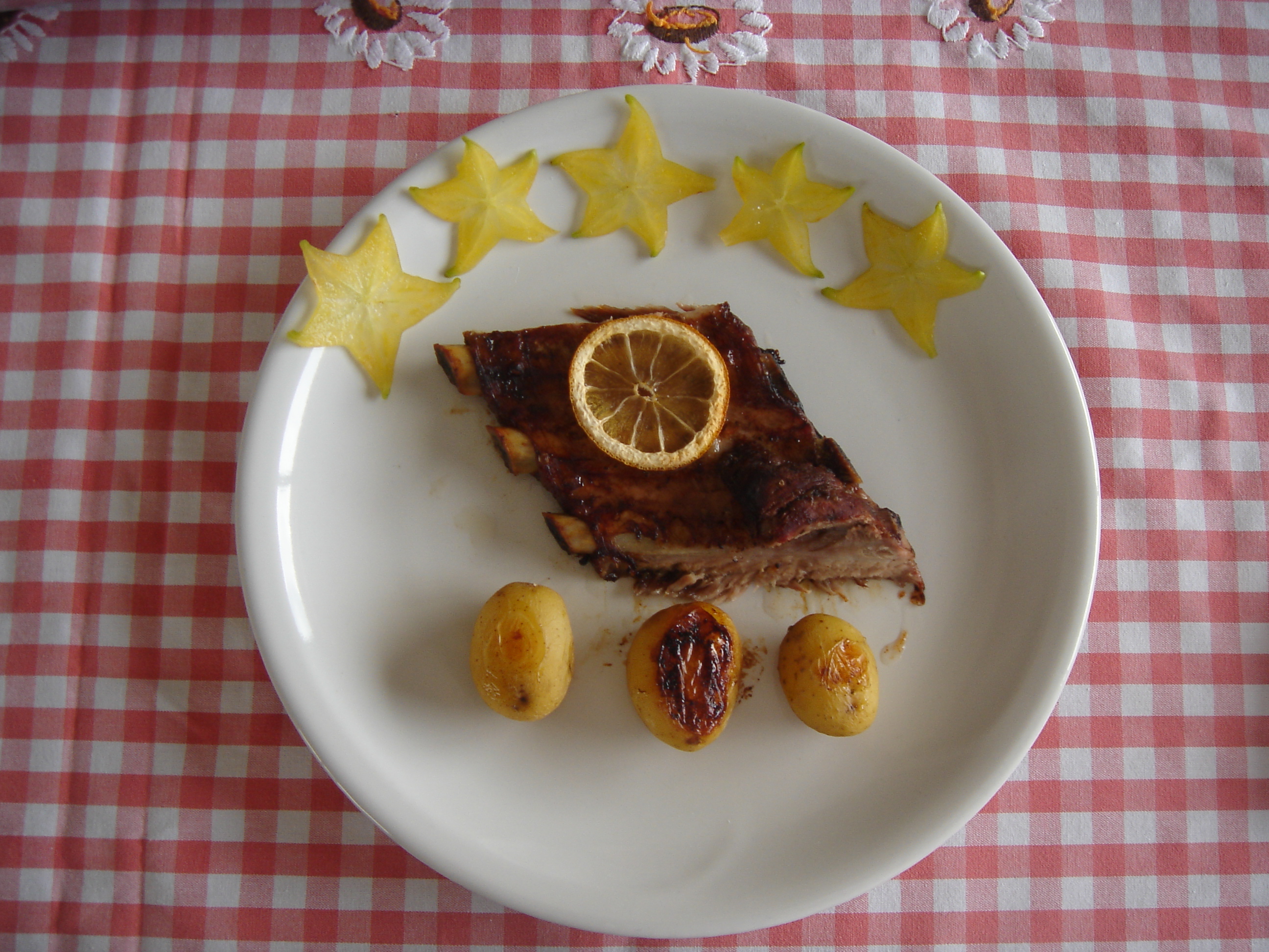 Tempere uma tira de costela de porco com sal, pimenta do reino e vinagre balsâmico. Coloque-a em uma forma e cubra com fatias de um limão siciliano; ao redor espalhe pequenas batatinhas inglesas. Leve ao fogo médio por cerca de duas horas. Sirva com carambola fatiadas, temperadas com sal e azeite de oliva.