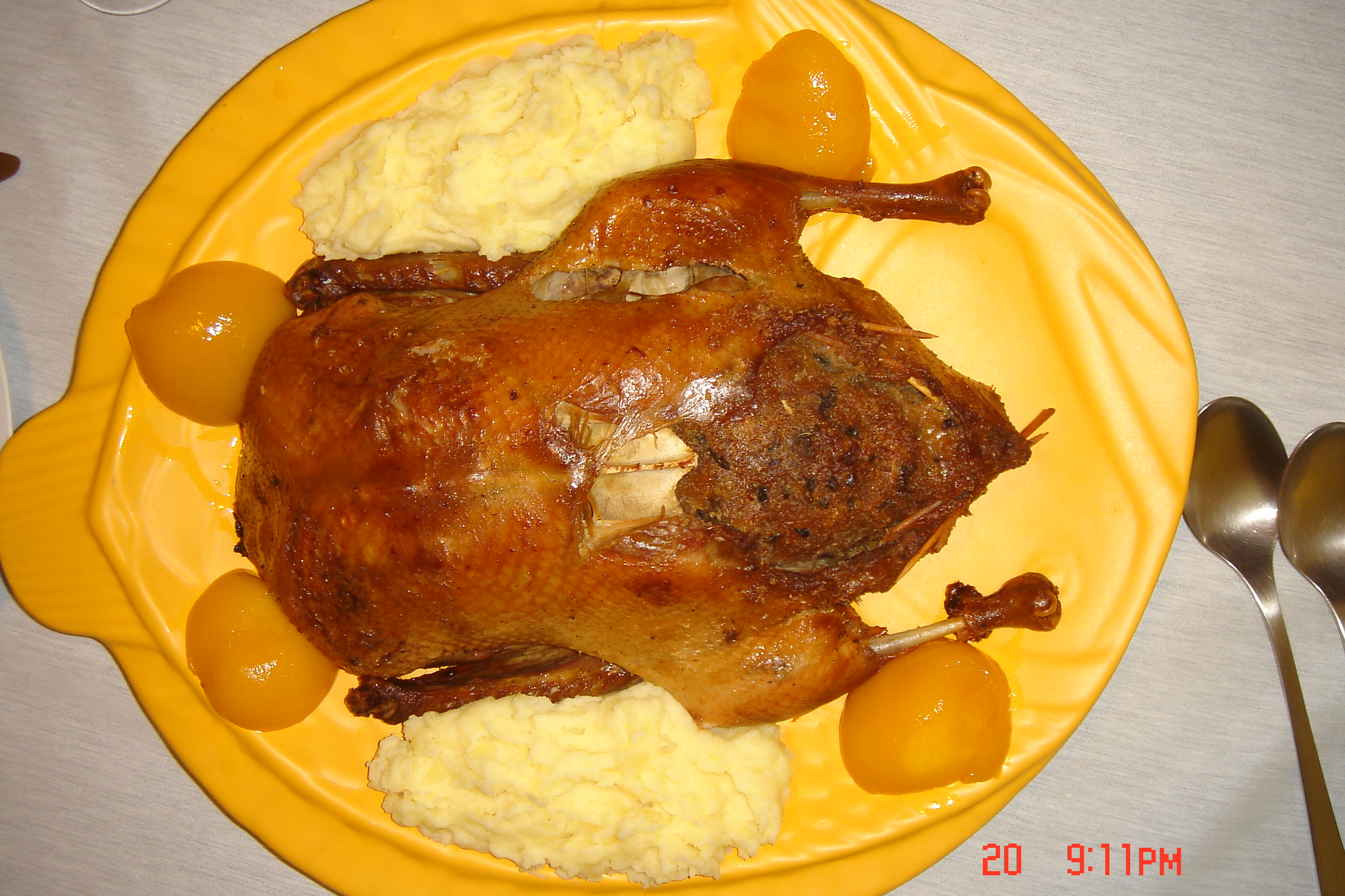 Coxa de Peru com molho de laranja e batatas assadas (na mesma forma e junto com o peru)