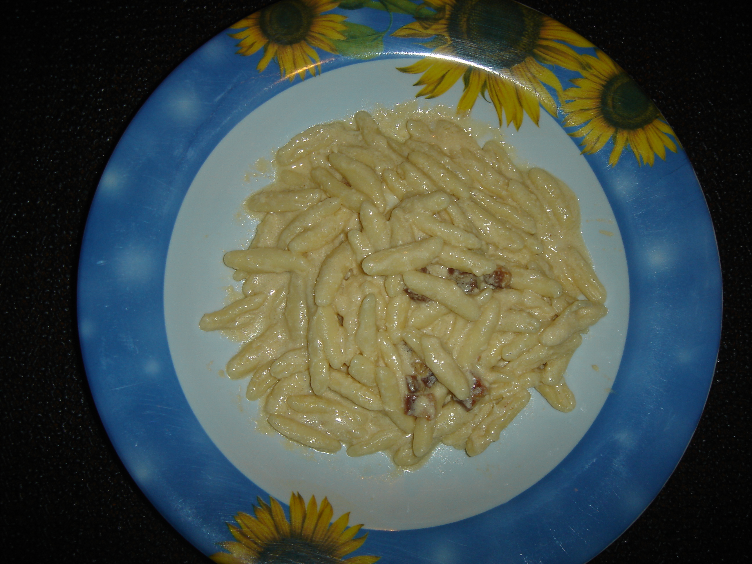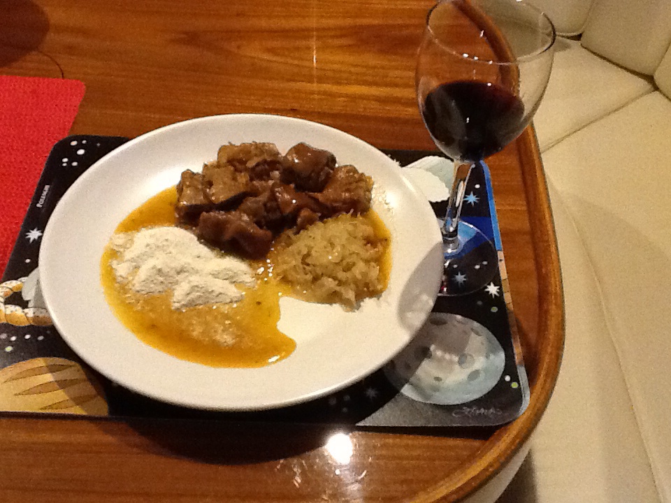 O mesmo molho aqui foi servido sobre nhoques de batatas (=pire de batatas, um ovo, trigo suficiente para dar liga, fazer rolinhos e cortá-los no formato desejado)