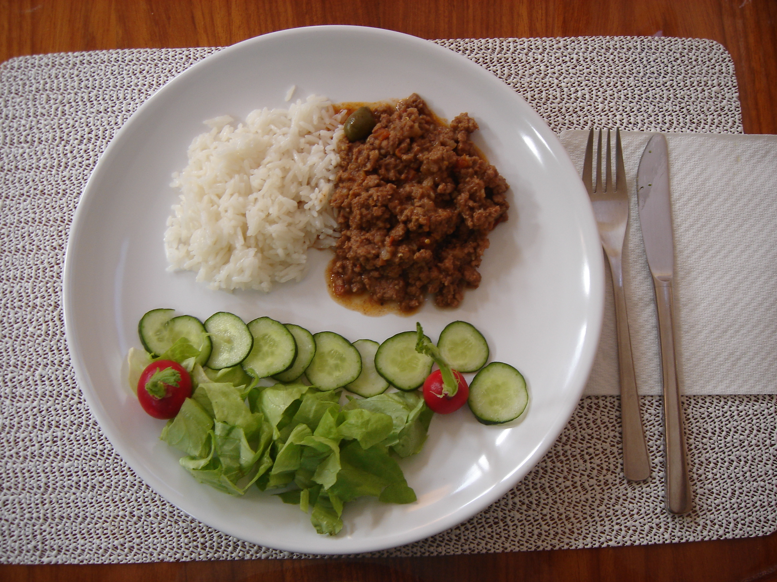 Em azeite de oliva doure dois dentes de alho, acrescente um cebola média cortada em cubos pequenos, um bulbo e as folhas de um alho poro também picados, e refogue até que a cebola fique transparente. Adicione cerca de meio quilo de carne picada em cubos grandes (3x3cm) e deixe-a selar de todos os lados, virando-a sempre que necessário. Coloque sal e pimenta do reino a gosto e uma colher das de sobremesa de páprica picante. Acrescente uma beringela e uma aboborinha verde cortadas em cubos, tape a panela e deixe cozinhar durante cerca de uma hora e meia, acrescentando um pouquinho de água sempre que necessário.
