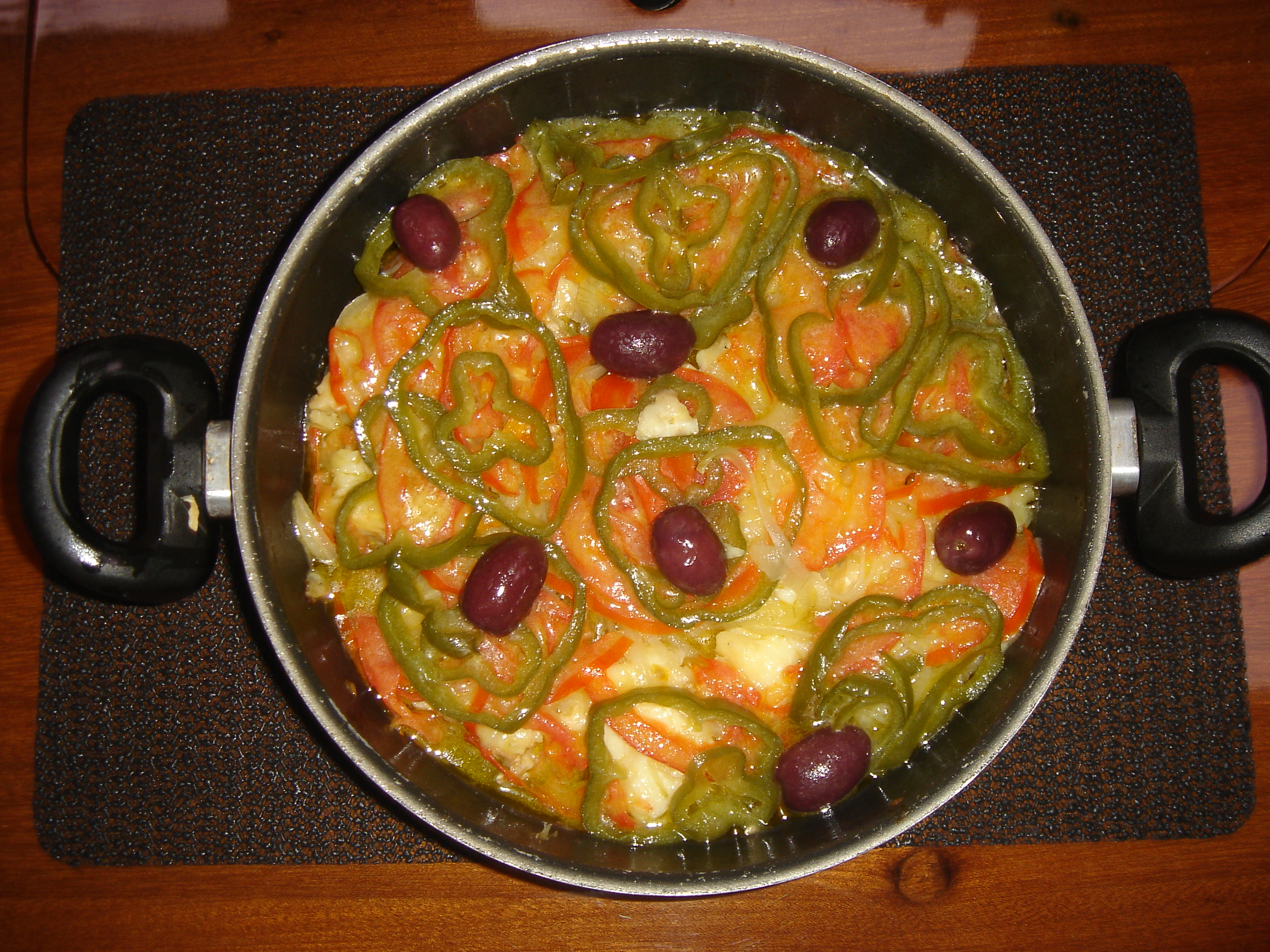 Dessalgue 500g de bacalhau durante 48 horas, mantendo-o sob refrigeração durante o processo. Retire as espinhas e corte-o em fatias com cerca de 2 cm de espessura e reserve. Cubra o fundo de uma frigideira com azeite de oliva extra virgem e monte o prato na seguinte ordem, de baixo para cima: cinco batatas inglesas fatiadas, o bacalhau, uma cebola, um tomate e um pimentão (todos fatiados) e algumas azeitonas pretas. Derrame cerca de 300ml de azeite de oliva extra virgem sobre os ingredientes e leve ao fogo médio até que as batatas estejam macias.