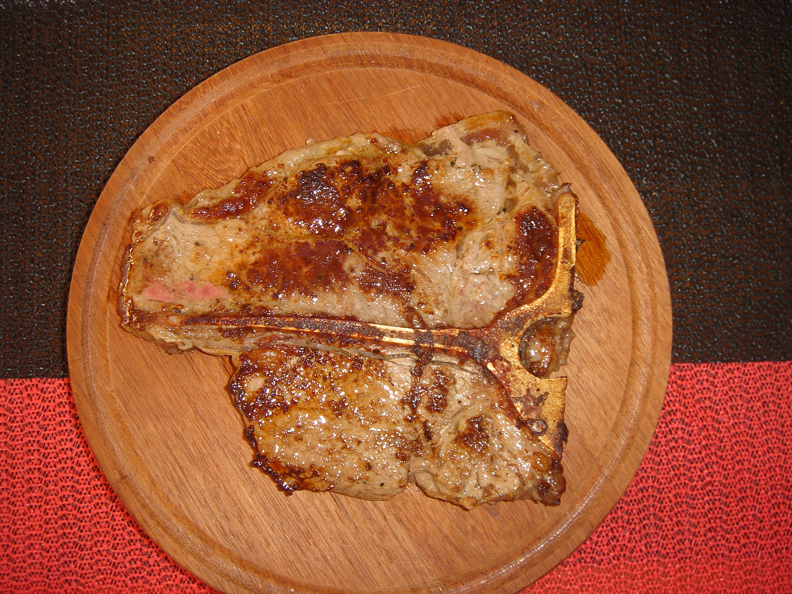 Tempere o T Bone com sal e pimenta do reino a gosto. Esfregue óleo nas duas superfícies da carne (qualquer um deles –  canola, milho, soja, etc.). Aqueça bem uma frigideira (sem adição de qualquer gordura) e coloque o T bone até dourar; vire e deixe dourar o outro lado (cerca de três minutos para cada lado).