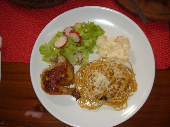 Sirva com maionese de batatas e espaguete (depois de retirar o frango da frigideira, passe a massa cozida na mesma, para absorver os sabores do assado).