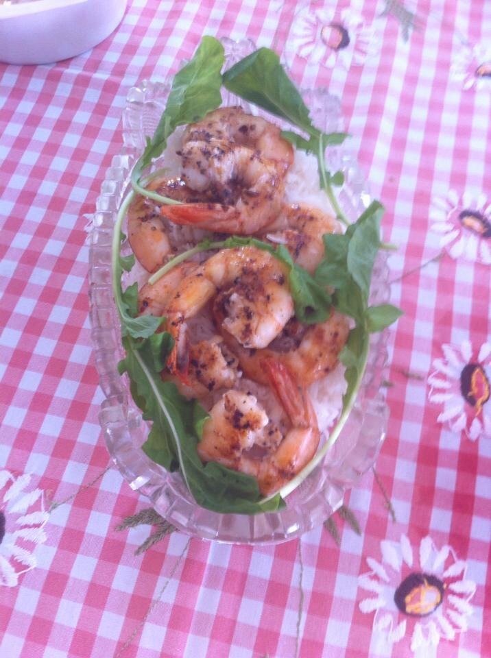 Descasque os camarões, preservando a cauda, e tempere-os com sal, pimenta do reino e azeite de oliva. Aqueça bem uma frigideira e grelhe os camarões por cerca de três minutos de cada lado (tempo necessário para camarões grandes). Cozinhe o arroz de forma tradicional (o arroz tipo indiano tem aroma e sabor bem peculiares, lembrando pipoca. Achei a combinação bem apropriada).