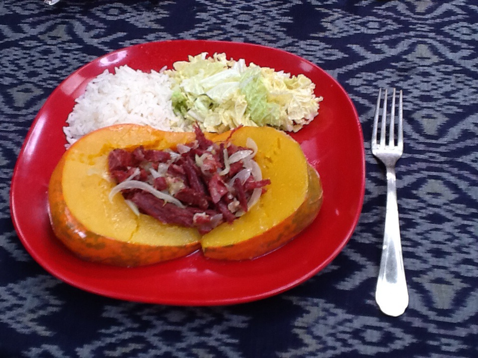Separe um pouco do caldo depois de cozido e, enquanto fervendo, misture com farinha de mandioca – fazendo o famoso pirão (pode-se acrescentar um pedaço da abóbora cozida, o que da cor e sabor ao pirão).