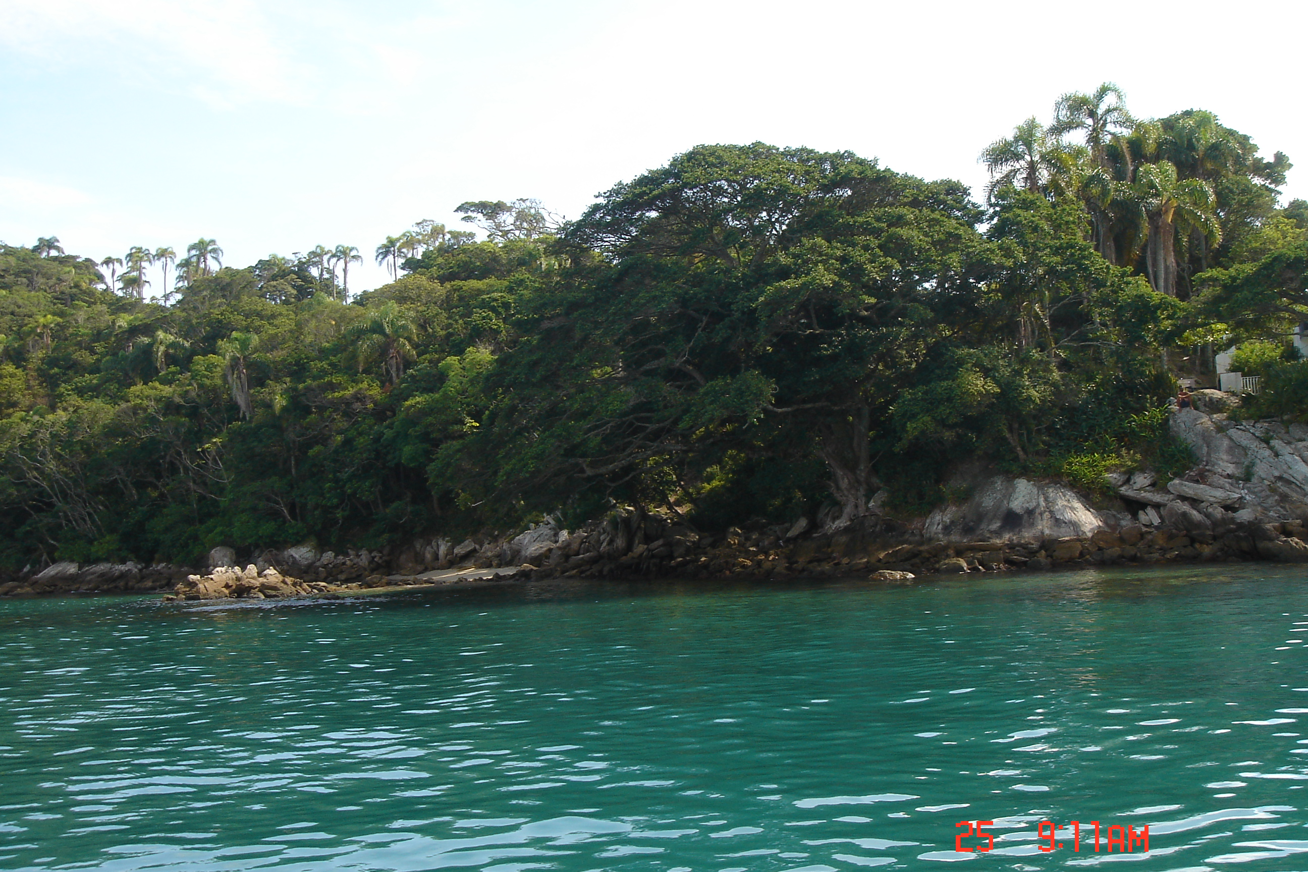 Acordamos bem cedo, em Jurerê, tomamos café e rumamos num dia lindo de sol e pouco vento. Fizemos uma navegada tranquila, no motor, porque não havia vento.
