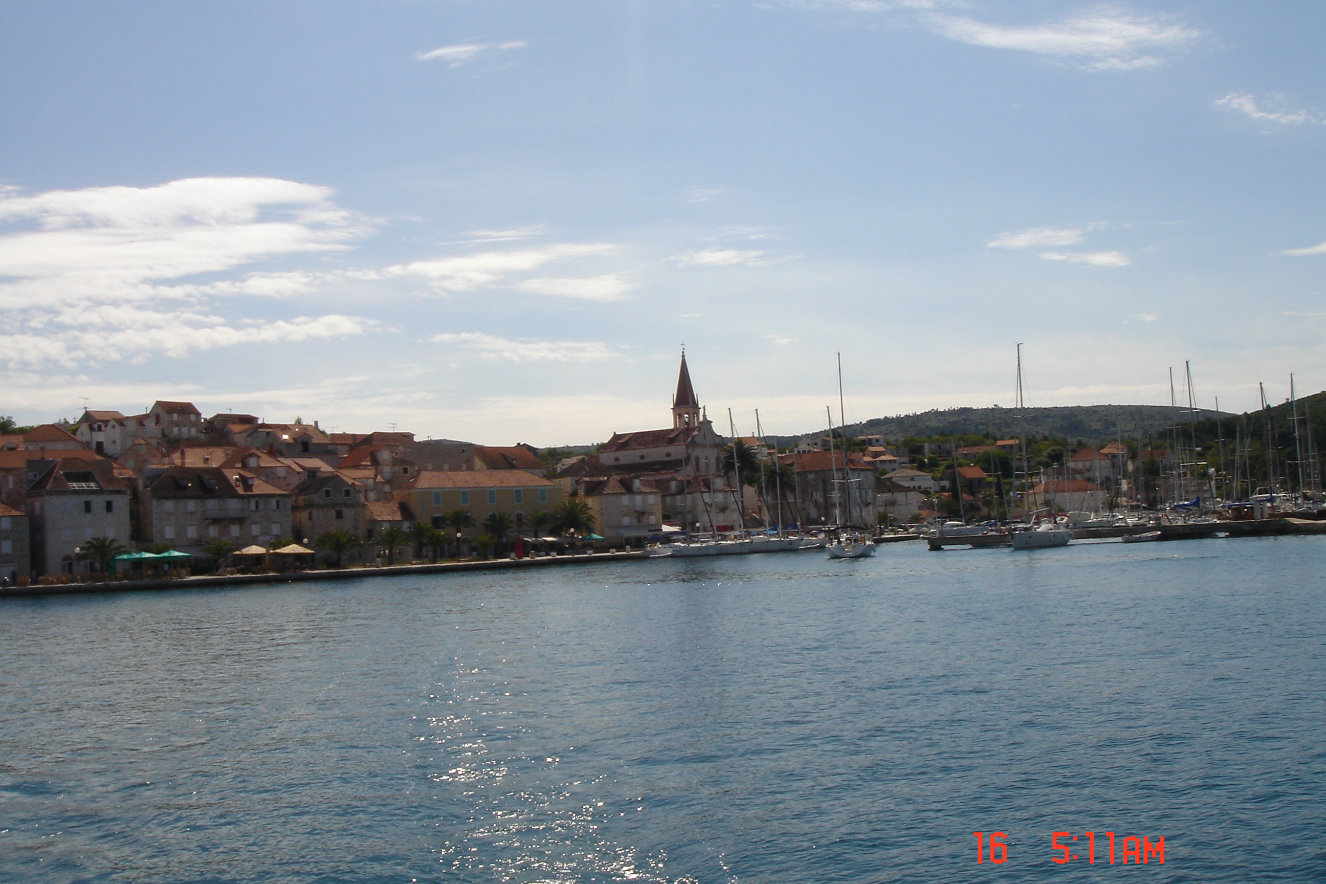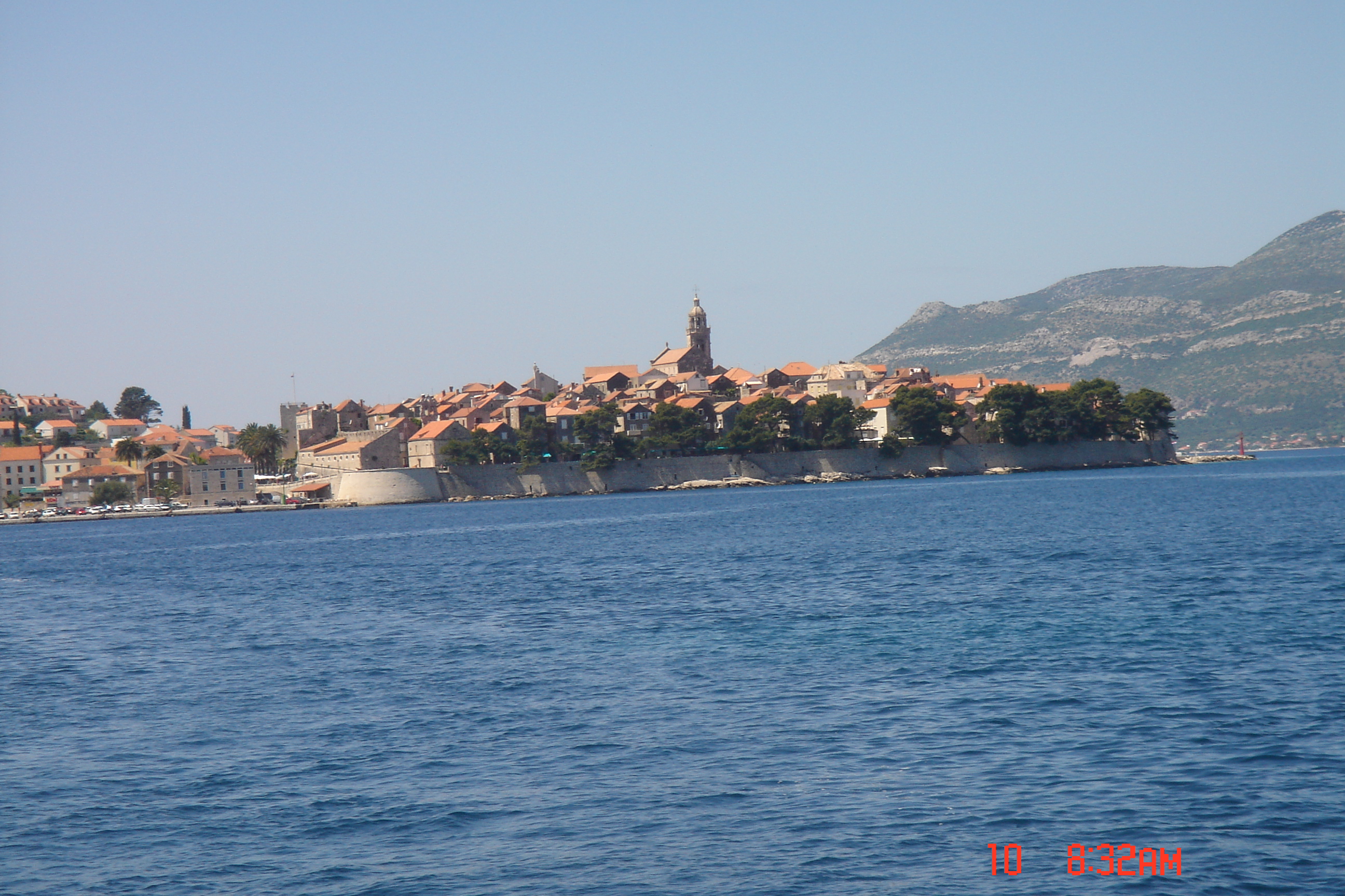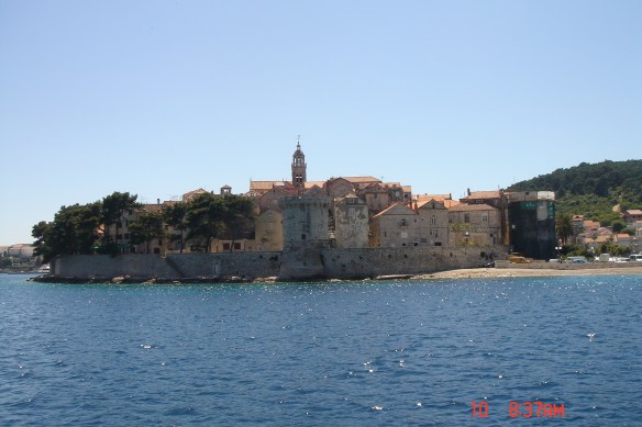08/05 –  Às dez horas, partimos de Vis em direção à Budikovak, onde tomamos banho de mar, numa água maravilhosamente azul turquesa e extremamente gelada. Depois, velejamos para a Ilha de Korcula, aonde chegamos às 17 horas. Desembarcamos e fomos conhecer a cidade que tem cerca de 4.000 habitantes. As muralhas e as torres são símbolos da cidade medieval (século XIII-XV) e estão quase completamente conservadas. A torre da porta oeste informa em latim sobre a fundação da cidade, posterior a queda de Tróia, e o acesso principal à cidade murada é a Kopnema vrata(Porta da Terra), ao sul. As estreitas ruas da área murada são muito peculiares: as que desembocam no lado oeste foram traçadas retas para que o vento mistral de verão refrescasse a cidade; as outras ruas são ligeiramente curvas para servir de barreira ao molesto e gélido vento bura e para permitir a adoção de estratégias defensivas ante invasões inimigas. Embora a verdade pareça não ser esta, os nativos afirmam que Marco Polo nasceu nesta ilha, preservando até os dias atuais a casa onde ele teria nascido e que é aberta à visitação pública. Fizemos várias caminhadas por toda a cidade e pudemos sacar com nossos cartões bancários o dinheiro local (kuna) em caixas eletrônicos que são instalados nas ruas.
