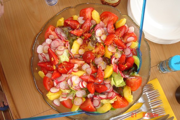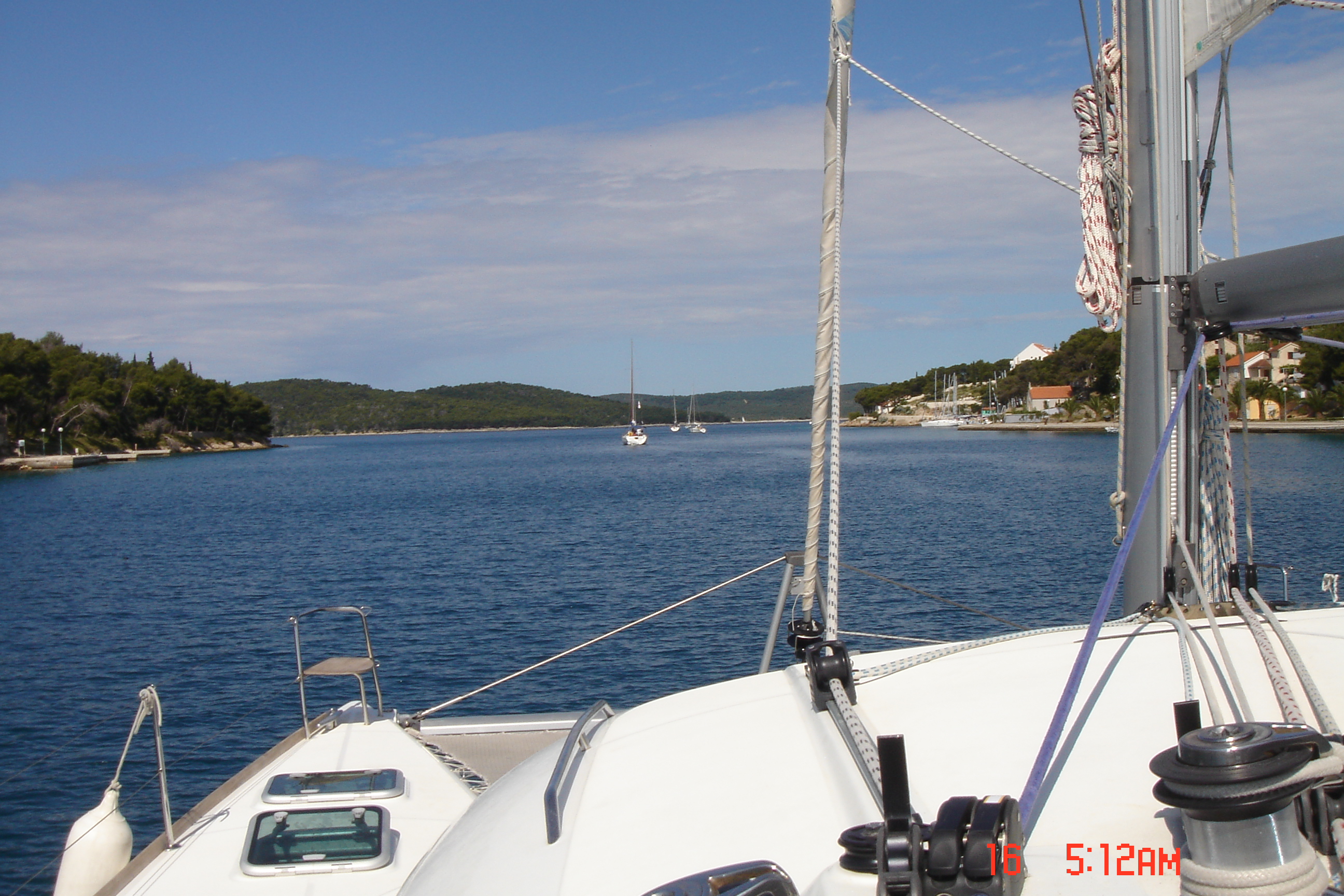 15/05 –  São 10h:10min e estamos partindo de Stari Grad, com vento soprando a 19 nós. Estamos fazendo uma velejada incrível e às 11 horas o vento apertou – 24 nós – obrigando-nos a rizar as velas. Velejamos a sete nós. Ancoramos em Cave Zukova, onde resolvemos improvisar um almoço – macarrão com atum e tomates enlatados, que havíamos comprado ainda em Split antes do embarque (escrito fileki no rótulo). Quando a Ângela abriu a lata de tomates, percebeu algo sólido e comentou: “acho que é prosciutto junto aos tomates”. Colocou na panela e, ao mexer, ficou indagando o que seria aquilo e, olhando melhor, concluiu que era bucho (dobradinha ensopada). Não falei que era difícil fazer compras em supermercado na Croácia? Macarrão com molho de dobradinha, nunca visto antes!