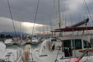 Já é quase final da tarde quando tomamos posse do catamarã. A primeira providência foi fazer um sorteio para a ocupação dos camarotes. Vivi e eu ficamos com o da proa de lado boreste. Durante a primeira noite, a chuva caiu intensamente, criando aquela sinfonia da água beijando o barco, gota a gota.