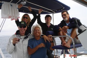 Não temos vela balão, então fazemos uma asa de pombos. O Cláudio e a Mônica fazem a proa, Vivi no timão, eu e Serginho cuidamos da regulagem das velas e de cambar a genoa quando necessário.