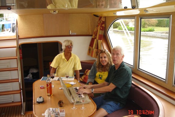 Nossos dias eram todos assim, navegando durante o dia e nos maravilhando com toda aquela beleza, alguns pedalando e acompanhando o La Manguelone que não podia navegar a mais do que três nós (velocidade máxima permitida no canal), comendo boas comidas a bordo ou em restaurantes que encontrávamos às margens do canal, bebendo vinhos maravilhosos nacionais – que comprávamos até por dois euros – e curtindo música à noite – levamos um pequeno teclado e tínhamos um pianista a bordo – Paulo Motta. Ele tocava e a turma cantava.