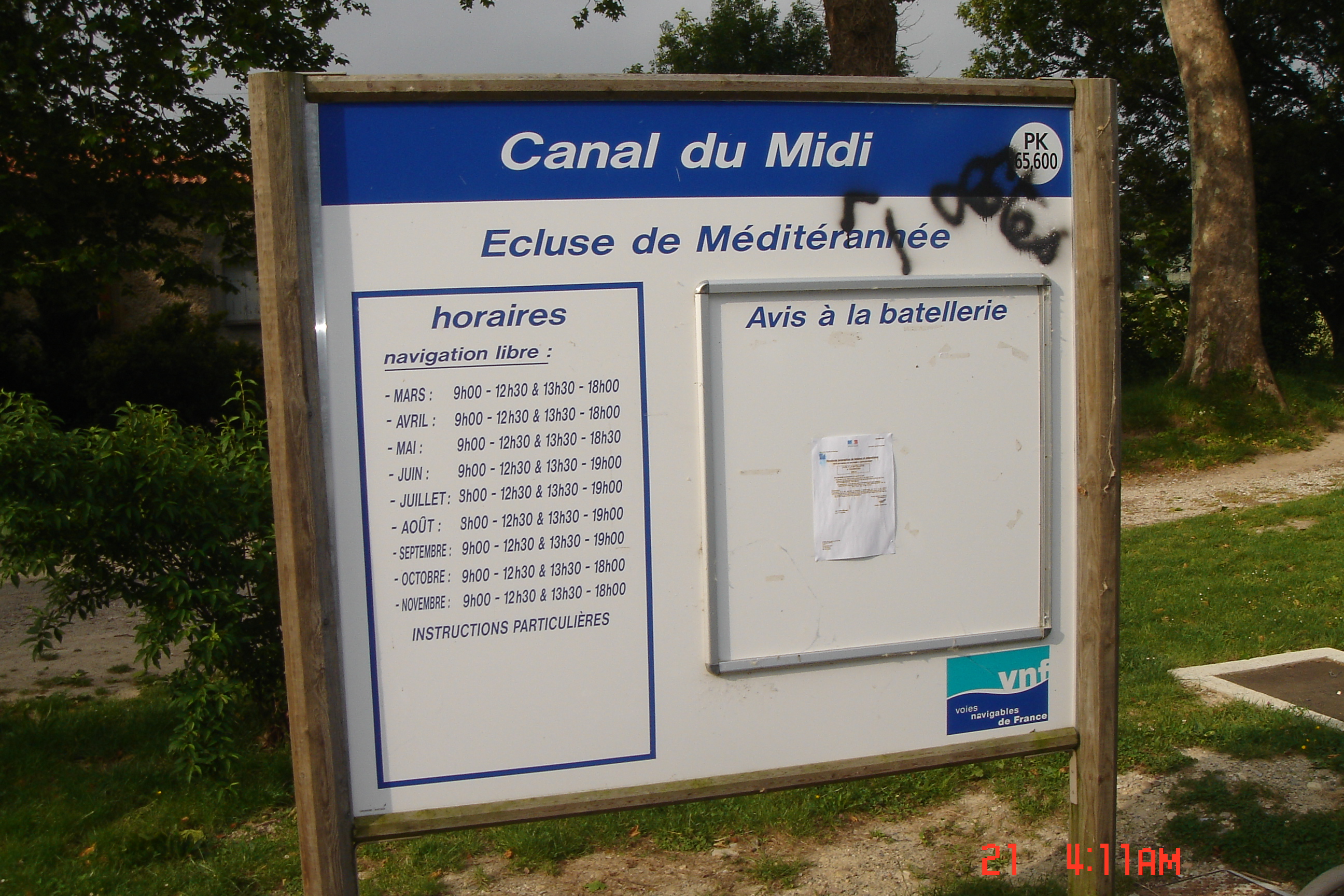 Estes canais são permeados por eclusas que tem por finalidade nivelar os desníveis da região. Desta forma, depois de poucas milhas navegadas você já encontra uma eclusa, depois outra, depois outra e assim por diante. Elas só funcionam durante o dia, portanto, durante a noite você não pode navegar. Assim, quando anoitece, você pega os cunhos de ferro que já estão a bordo, finca-os na margem em terra, prende os cabos de atracagem, bebe muito vinho e dorme até o dia seguinte.
