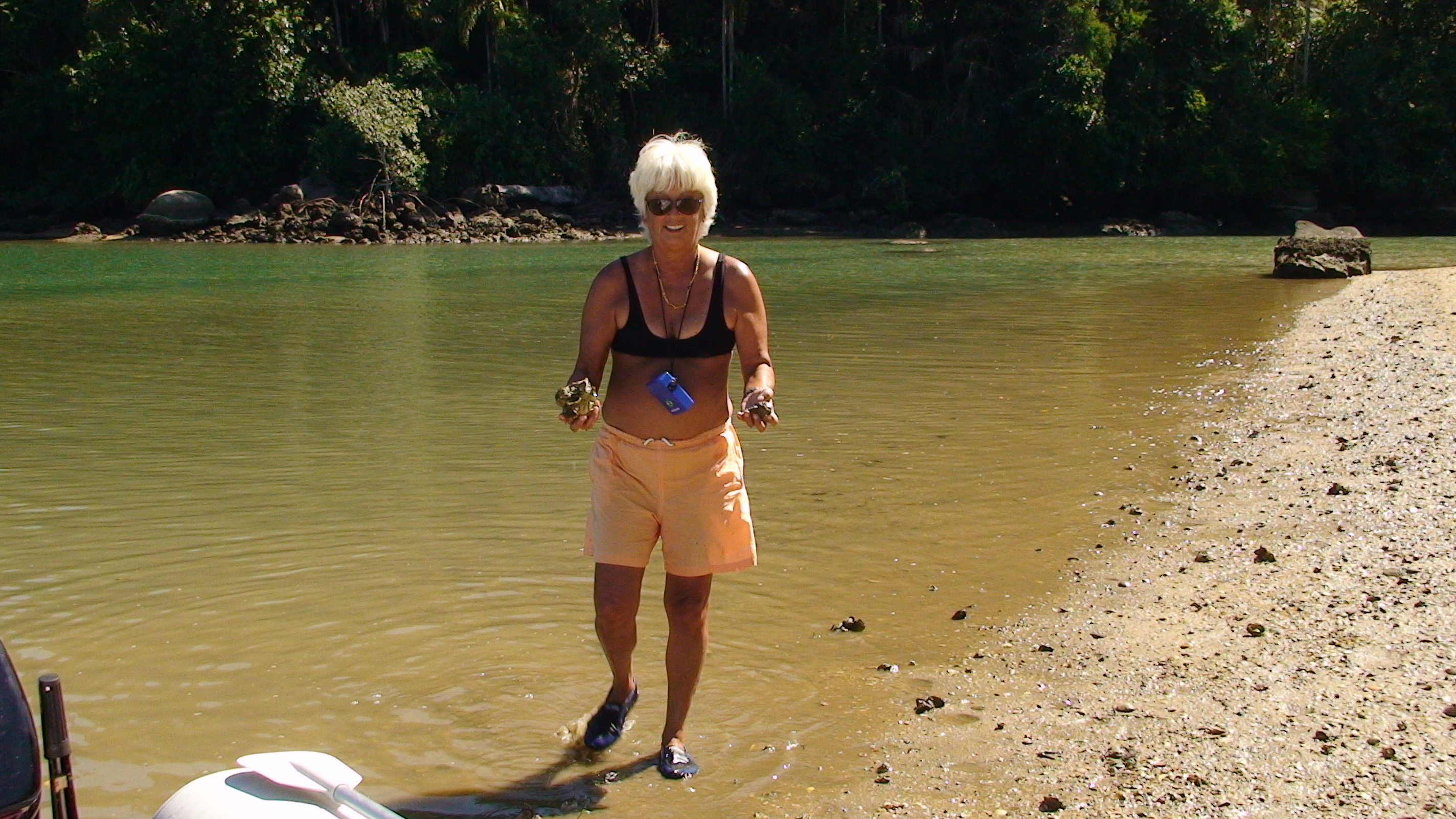 Saímos para passear de bote inflável e fomos levadas a um lugar onde as ostras eram tantas que o apelidamos de “Paraíso das Ostras”. A Vivi colheu um balde delas, que comemos depois a bordo, preparadas ao bafo. A gente acaba comendo ostras de cativeiro, principalmente na nossa terra – um dos maiores criadouros do Brasil – mas nada se compara às ostras nativas. O sabor é completamente diferente daquelas cultivadas, que são trazidas do Pacífico para nossas águas. A nossa ostra nativa tem cheiro e sabor de mar, não é excessivamente salgada como a outra, chegando a ser quase doce.