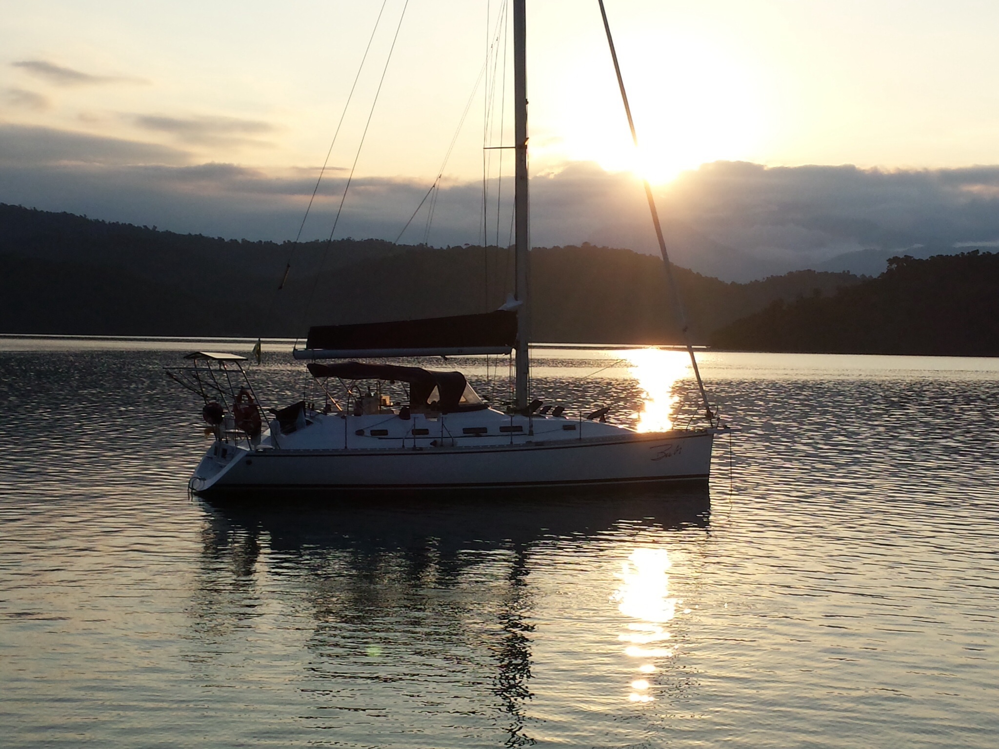 Amanhece com muitas nuvens no céu, mas, em seguida, a névoa branca vai subindo e o sol nos aquece com sua energia mágica. A maré está alta desde às seis horas da manhã e agora, dez horas, já começou a baixar. Vivi queria ir tirar ostras lá no Saco do Fundão, mas, com maré alta não é possível e, com maré baixa, não podemos entrar na nossa vaga na marina (o Bubi arrasta a quilha e pode tocar numa poita, como já aconteceu uma vez). Assim, retornaremos agora, pois a maré só volta a estar alta à noite.