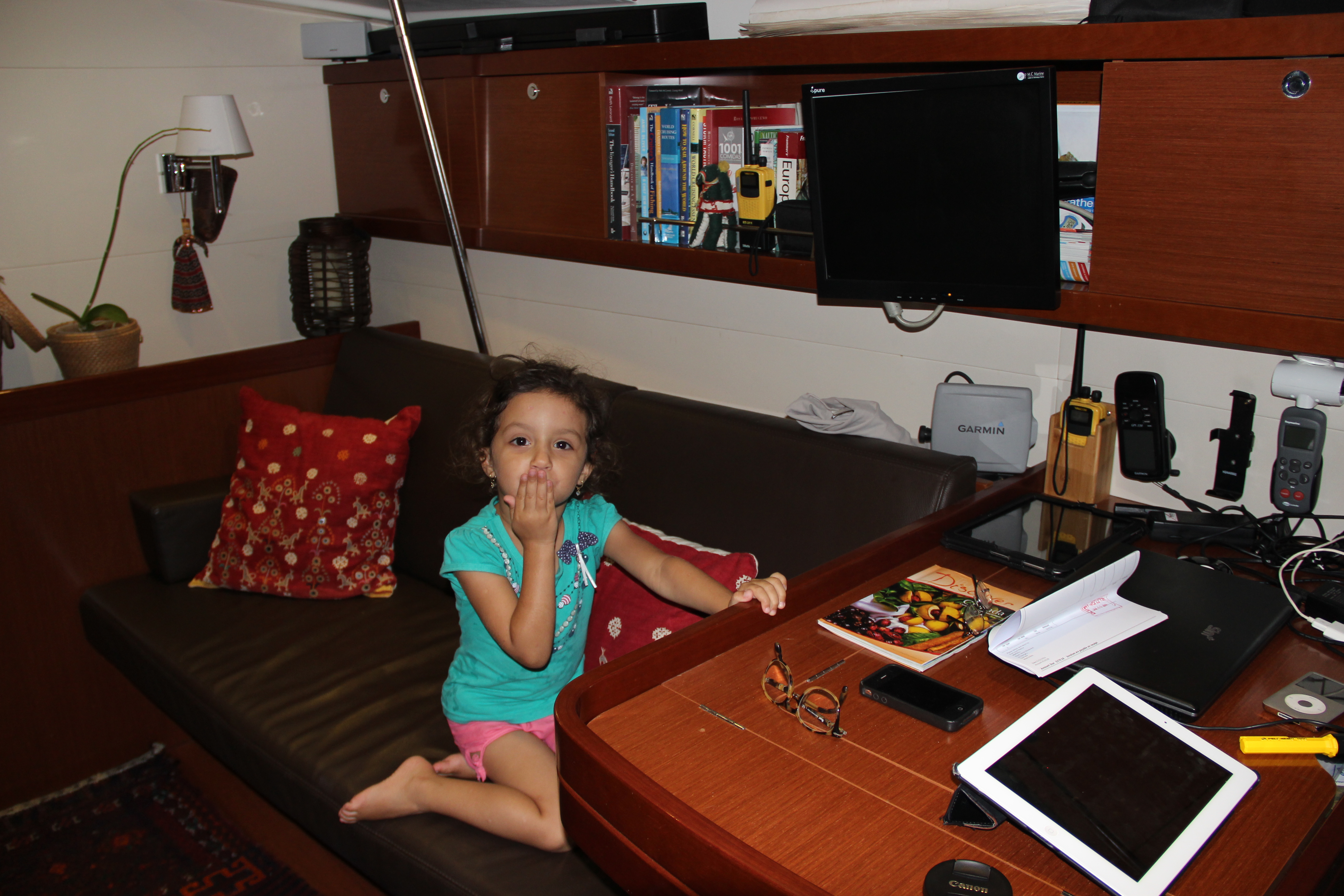 Do veleiro Sotália, que está ancorado próximo a nós, logo cedinho, Marina nos abana e manda beijinhos soprados na palma da própria mão.