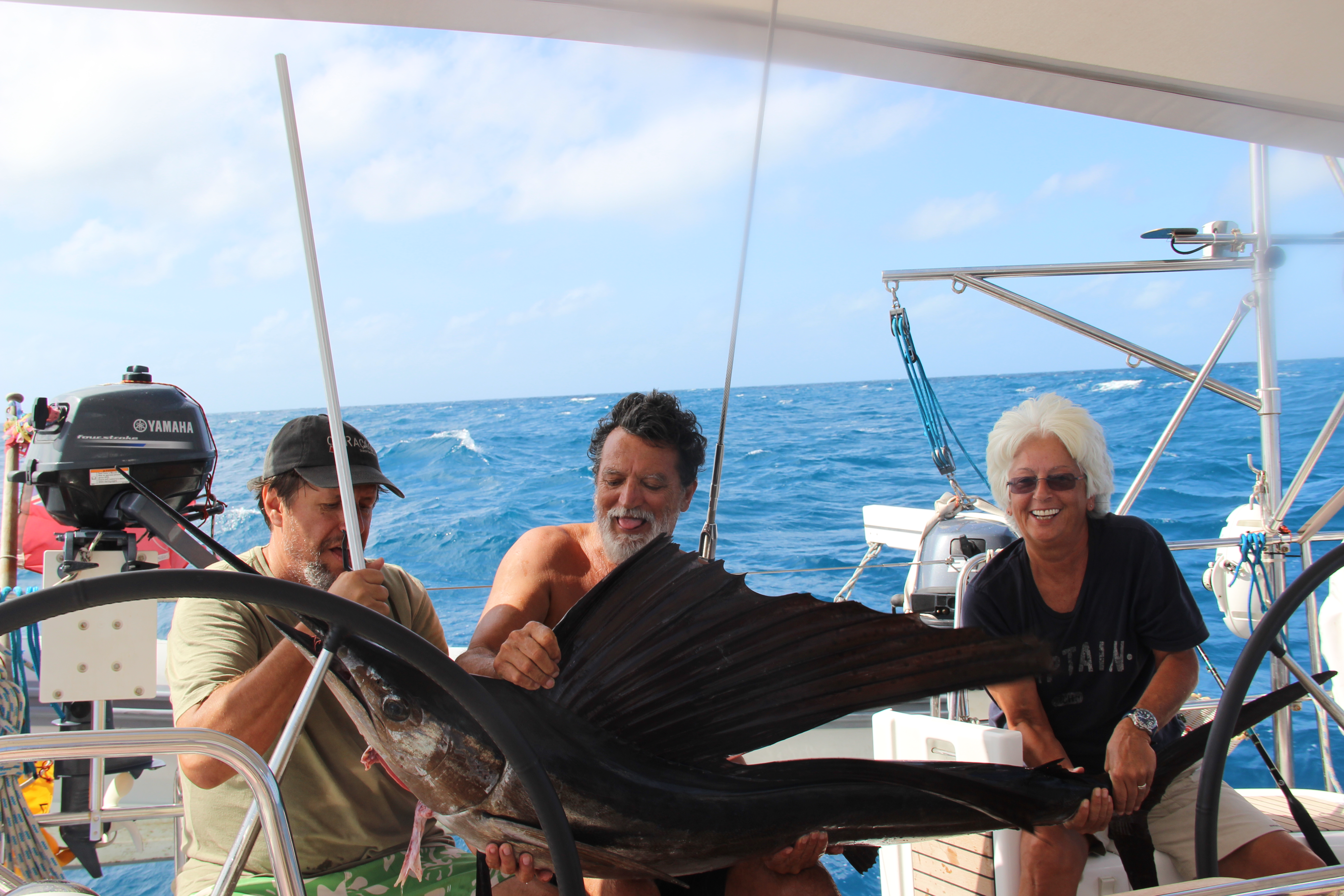 Ele e Dávila falaram com empolgação: – pegamos um grande, dessa vez, dá para perceber pelo peso. Corri e chamei a Vivi, para ela curtir também, já que ela adora pescar. Bem, resumindo, foram uma hora e meia de trabalho para cansar o peixe e aproximá-lo do veleiro. Dávila e Álvaro se revezavam nesse trabalho, porque eles cansavam mais do que o peixe. Ninguém sabia que peixe era, imaginamos um atum enorme, até que ele chegou bem perto e vimos tratar-se de um Sail Fish enorme e lindo. Ele brigou muito, acabou se trancando no leme, até que Dávila conseguiu trazê-lo para dentro do cock pit. Pobre peixe, logo que foi embarcado abriu uma vez apenas suas guelras, como um último suspiro, e já estava morto. Eu fiquei muito impressionada, chorei, mas, pensei, é a lei da vida – ele só morreu, porque comeu o que ele achava ser outro peixe; ele também é um predador. Consolei-me um pouco com isso, mas ainda assim fiquei duas noites sem conseguir dormir direito pensando naquele peixe lindo. Lembrei-me do Stefen Hawkin que diz que nós humanos somos parasitas, porque nos alimentamos de outros seres vivos.