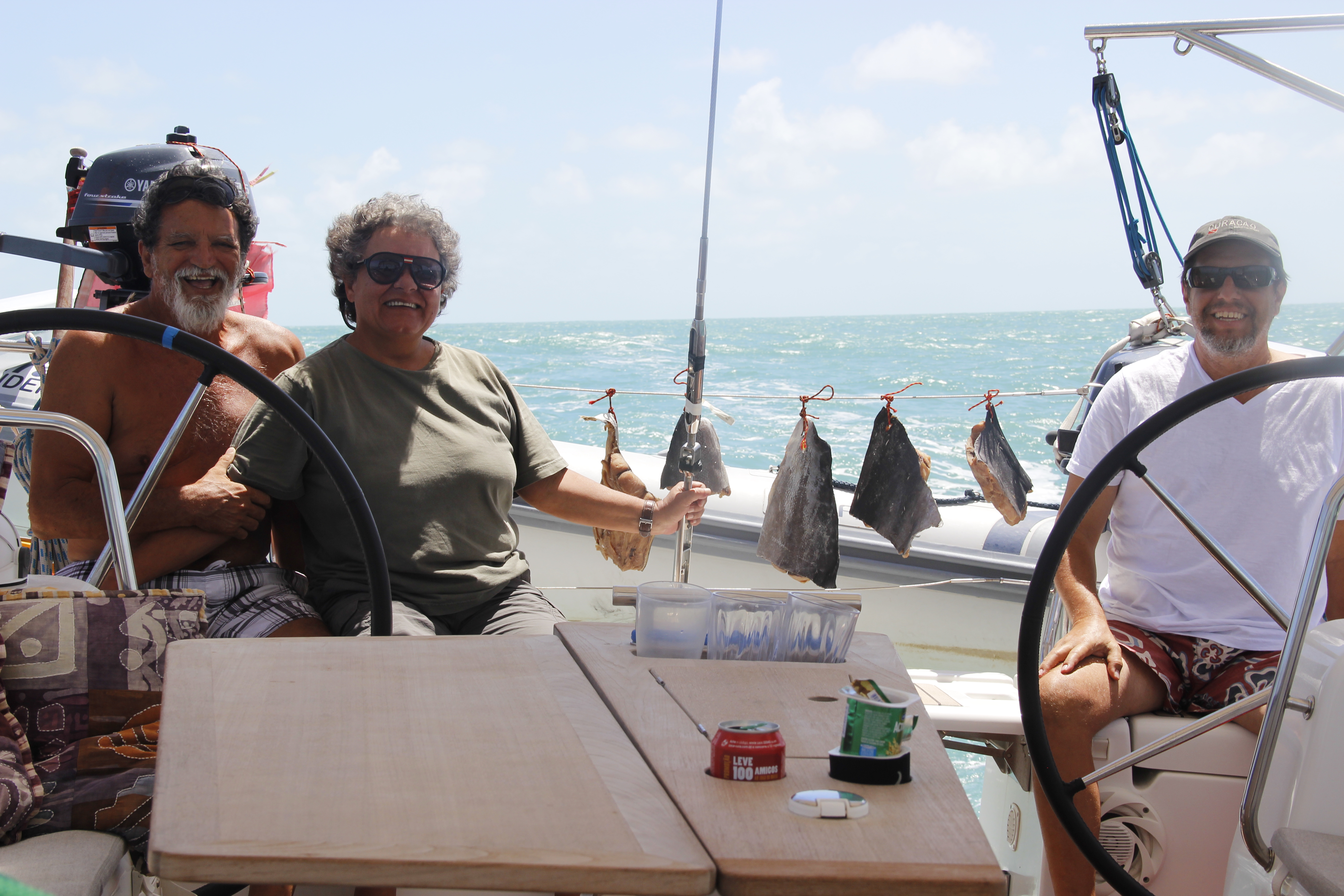 Estávamos na nossa hora de descanso, eram 8h30min quando acordamos com aquele barulho intenso e característico de cabos sendo recolhidos nas catracas elétricas. Depois disso senti que o barco havia parado. Pensei: – o que aconteceu, o vento parou por completo? Mas o motor não foi ligado! – Subi ao cock pit e vi que as velas haviam sido recolhidas e que Álvaro estava recolhendo a linha da carretilha com bastante dificuldade (desde que saímos de Fortaleza, sempre deixamos a linha na água e já havíamos fisgado outros peixes, mas eles sempre escapavam antes de serem trazidos a bordo).