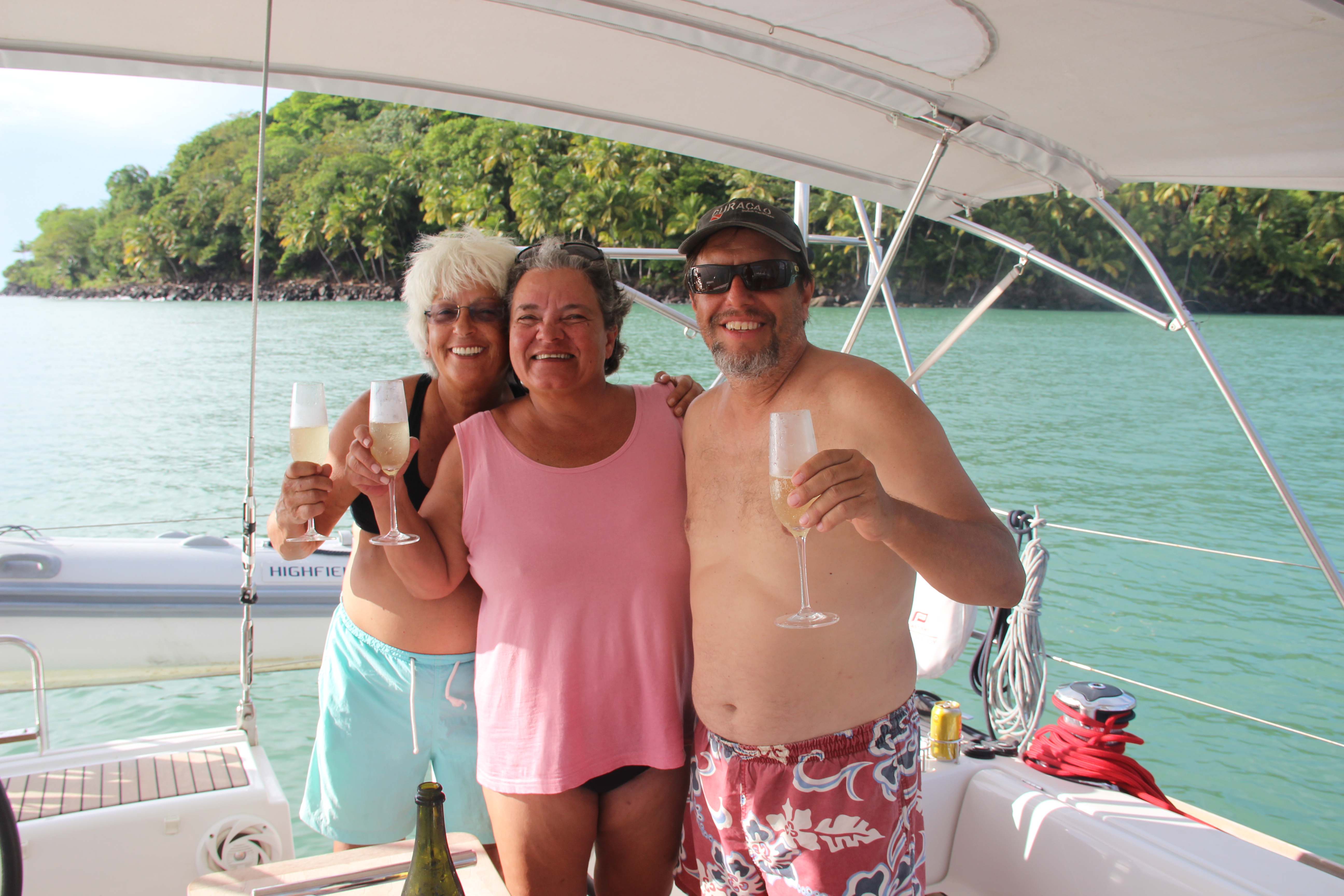 Depois dos procedimentos de ancoragem, corremos a baixar o bote para liberar a escada da popa, porque o mar nos chamava para um banho. Nossa, e que banhos! Abrimos o espumante que reserváramos para nossa chegada e o Álvaro colocou a rodar um CD com suas músicas favoritas – sertanejas. Mas ele merecia ouvir o que quisesse ouvir, porque é um querido. Aliás, ainda não comentei isso: nossa velejada foi maravilhosa, nosso entrosamento a bordo foi perfeito, não ocorreu qualquer incidente ou desconforto entre nós quatro. Parecemos uma família em férias curtindo plena felicidade.