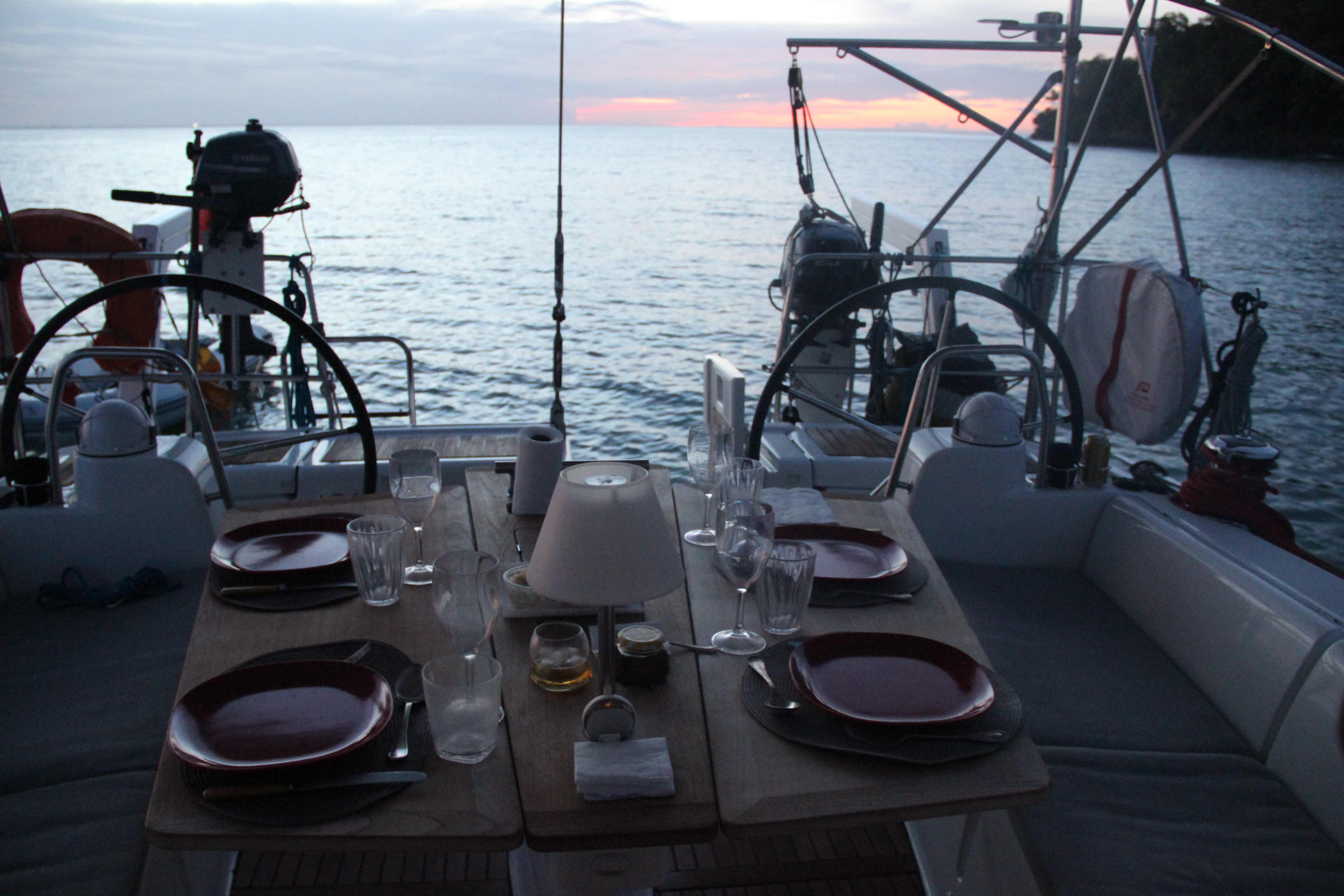 Na volta, Vivi foi para a cozinha e preparou frango ensopado, macarrão e maionese. Jantar de primeira, com uma linda mesa posta no cock pit, ao som de jazz e regado a vinho tinto.