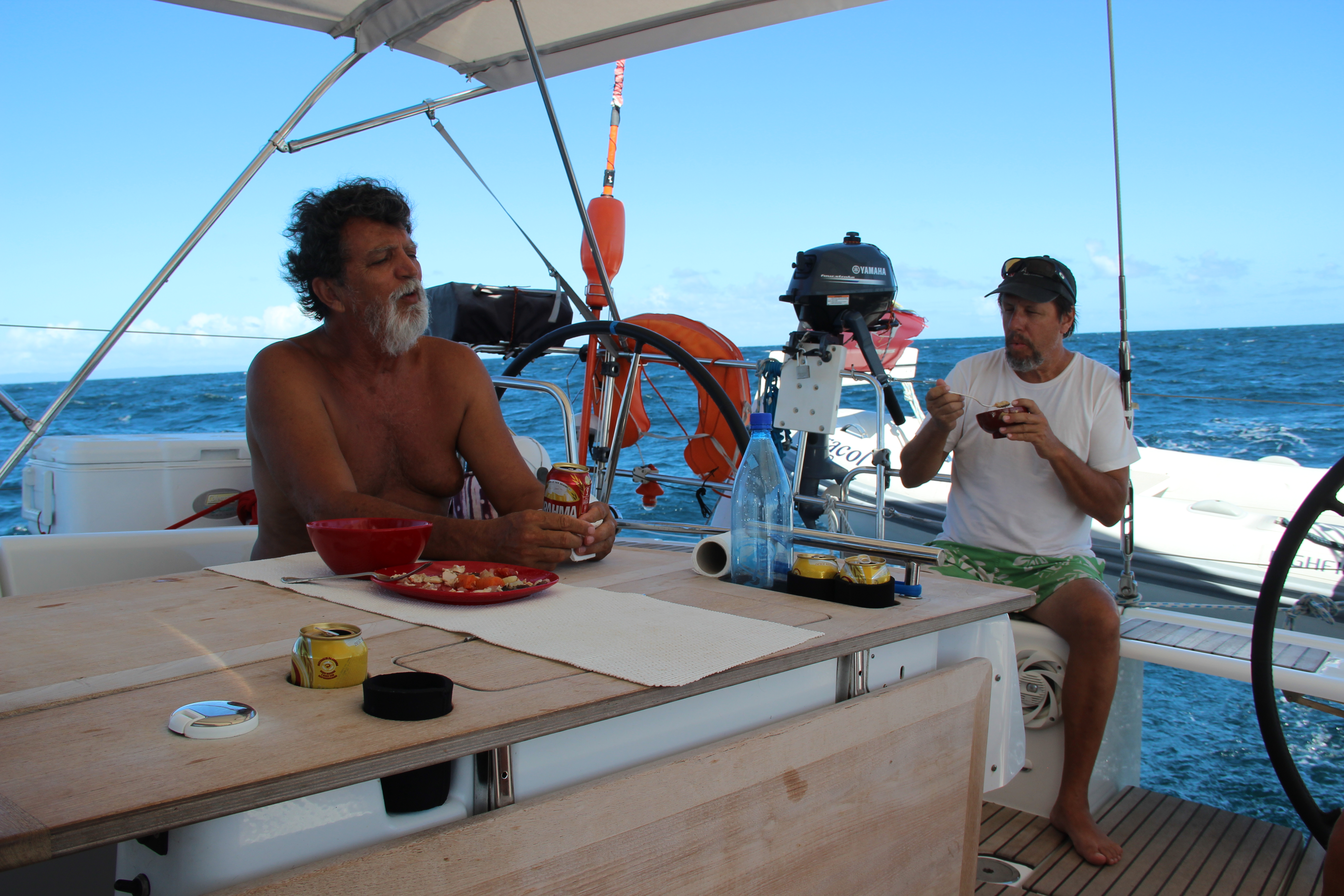 Às 09 horas o vento cresceu para 18-20 nós e nossa velocidade também aumentou para 9,7, chegando a 10 nós nas rajadas. As duas velas estão todas abertas e, se o vento continuar aumentando, teremos que reduzir panos. Mas o vento se mantém na mesma intensidade e roda um pouco, passando a entrar pela popa, às 12 horas, o que nos obriga a fazer uma asa de pombo. Novamente os meninos, Álvaro e Dávila, vão para a proa organizar a montagem do pau de spinaker (que é quase do tamanho de um poste e com quase o mesmo peso de um), enquanto Vivi e eu ficamos no cock-pit adriçando o amantilho ou caçando o burro do pau e a escota da genoa, sob os comandos deles). Isso é muito divertido e libera uma adrenalina fantástica, porque nenhuma dessas manobras é feita sem o balanço do mar, que torna nossos movimentos bem desengonçados.