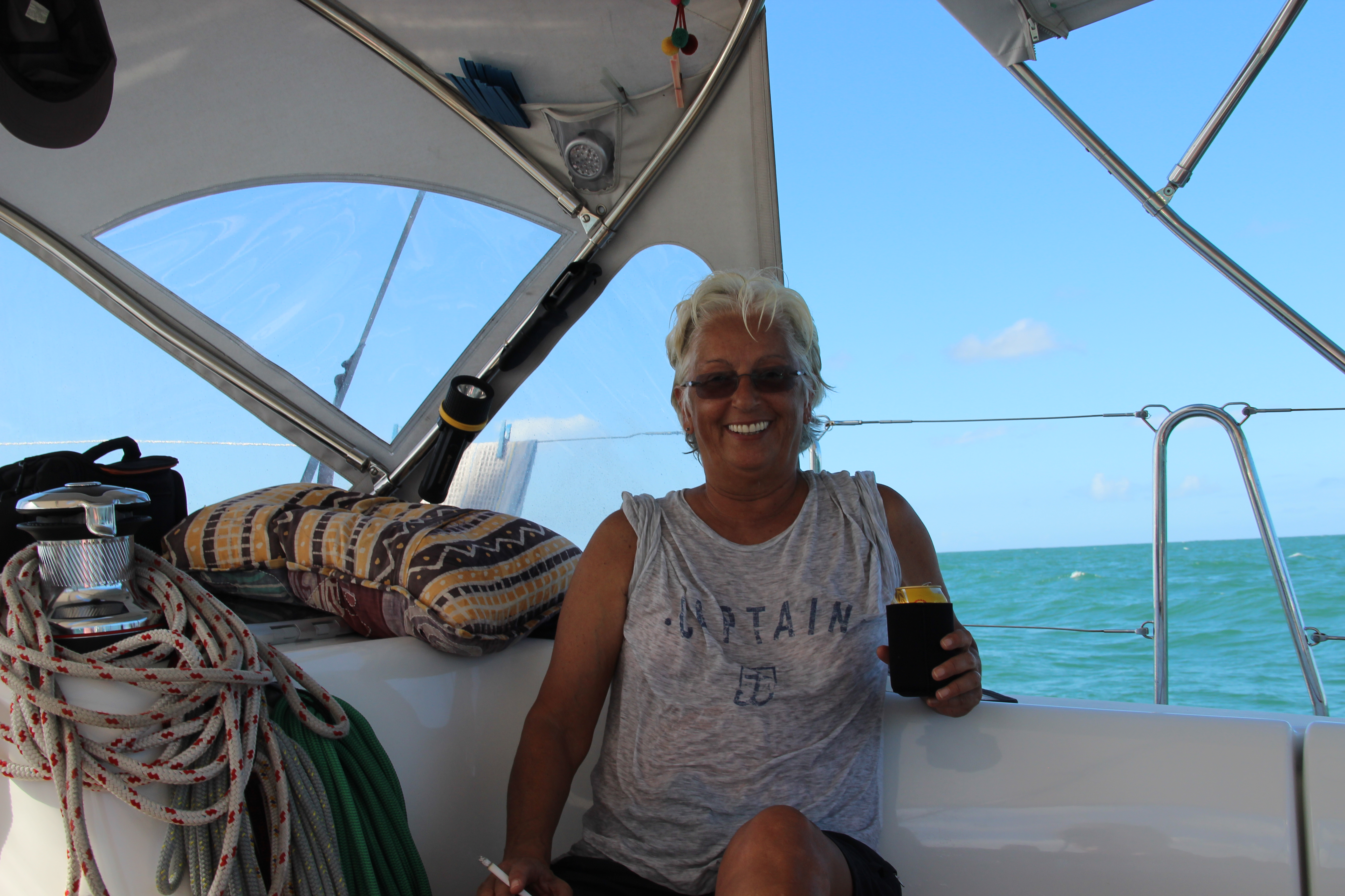 Às 11 horas o vento se mantém em 14 nós, nossa velocidade é a mesma (8kn) e nosso rumo 330 graus. Observo que a genoa está panejando no tope e resolvo regular o carrinho da escota (nesse veleiro você não precisa sair do cock pit para mudar o carrinho de lugar, basta caçar um cabo que o movimenta para frente). Traciono o cabo, mas ele está bem pesado. Sentada, apoio os pés na lateral da entrada da gaiuta principal e, com as duas mãos, tento novamente mover o carrinho para frente. Uma onda inesperada balança o barco violentamente para bombordo e bato com as costelas da região submamária esquerda na fibra. Uh, que dor! Mas não desisti, me posicionei melhor e consegui mover o carrinho até a genoa parar de panejar o tope.