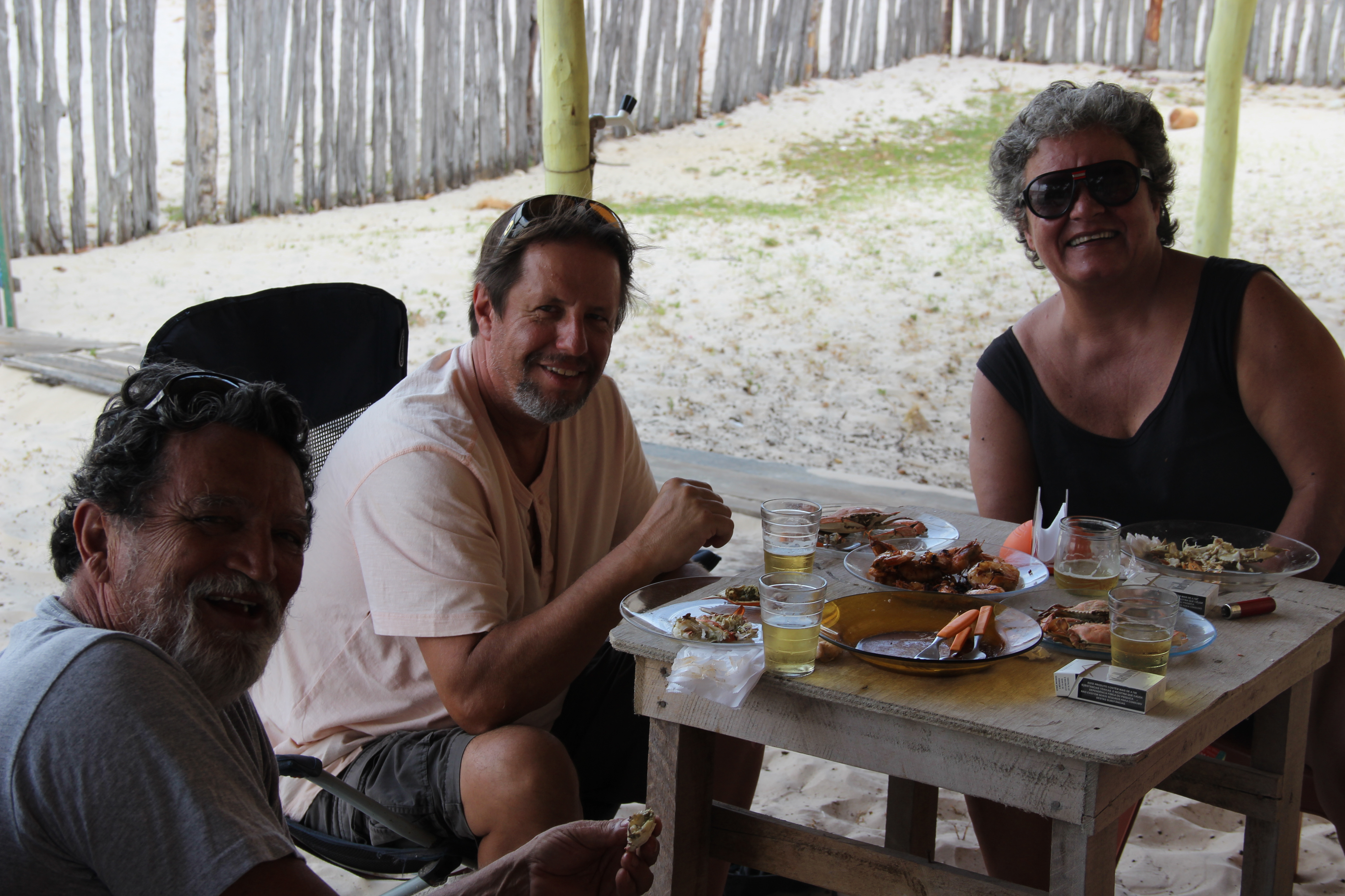 Hoje vamos sair para passear e conhecer um pouco de Fortaleza. Vamos até o Chico Caranguejo, lugar tradicional à beira do mar. Uma festa! Os ambulantes passam oferecendo de tudo o que se pode imaginar, desde frutos do mar dos mais variados até todo tipo de bugiganga. Escolhemos quatro lagostas vivas que nos foram trazidas minutos depois grelhadas na manteiga. Uma delicia. Depois os famosos caranguejos, que não estavam do nosso gosto, porque eram muito magros e foram cozidos em leite de coco e uma exuberância de coentro. Mas valeu! O lugar é muito lindo, mas esqueci de anotar o nome da praia. De volta à Marina, conhecemos vários velejadores que estão dando volta ao mundo – italianos, franceses, espanhóis, um holandês, de vários veleiros. Ficamos no bar da piscina trocando idéias e ouvindo sobre suas experiências.