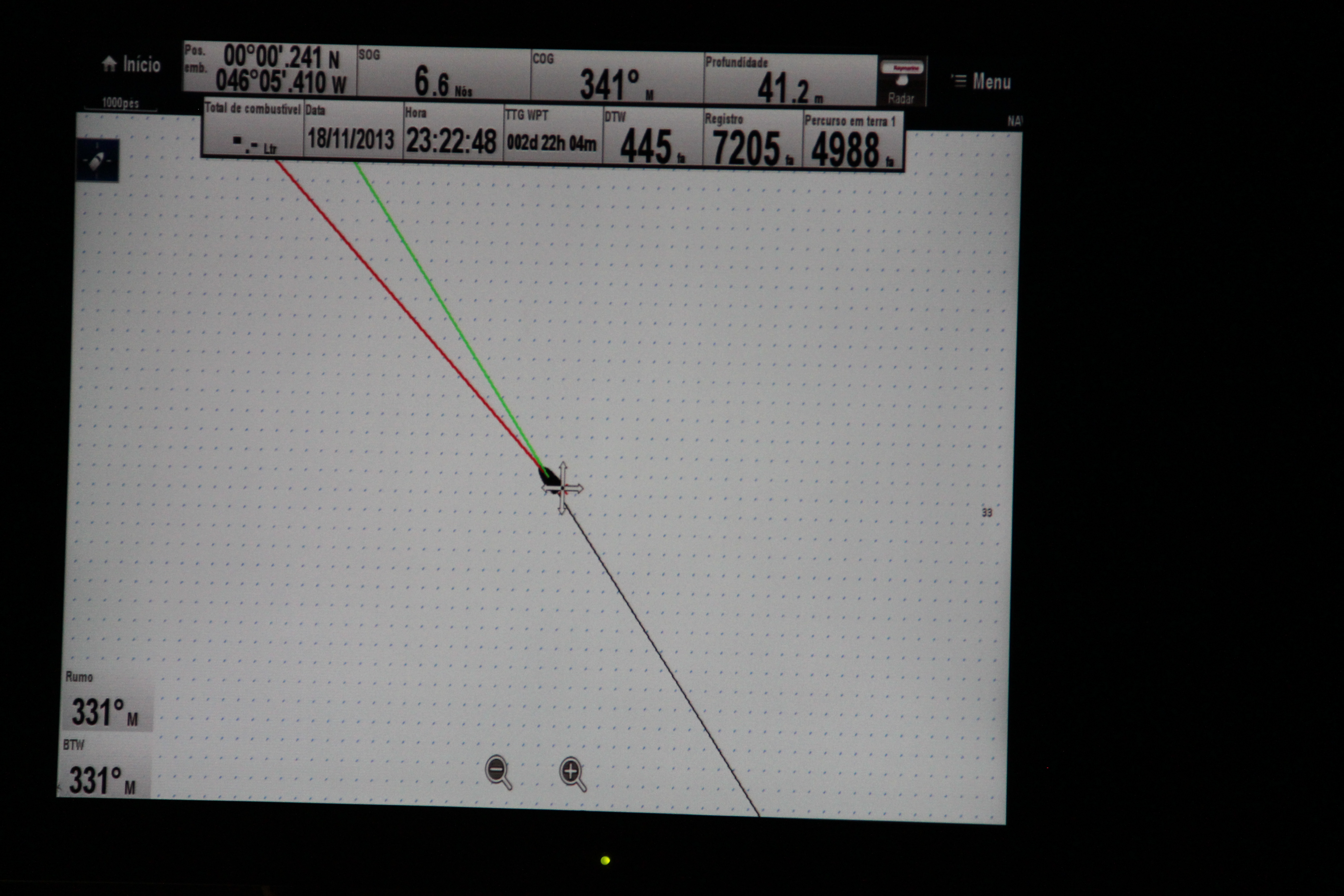 Rumo traçado no GPS – 332 graus, distância 615 milhas náuticas.
