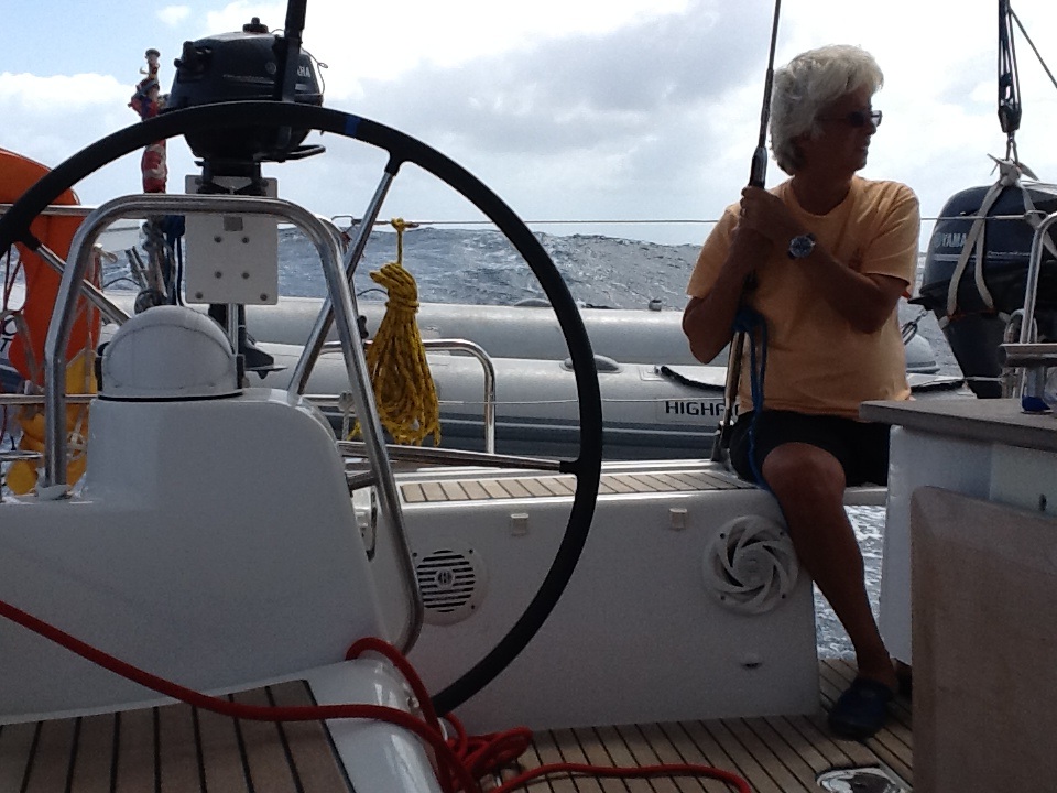 Às 15 horas, pela primeira vez, ligamos o dessalinizador. É muito bom saber que não faltará água, que o banho pode ser normal e diário. Aliás, ainda não comentei que esse barco é muito bem equipado – 3 catracas elétricas que facilitam todo o trabalho de abrir, recolher ou rizar velas, enrolador genoa e de vela grande no mastro, thruster, dock and go (esse equipamento nunca tínhamos visto: permite que se movimente o veleiro em qualquer direção, porque gira a rabeta para qualquer lado, facilitando as manobras de chegada e saída do cais).