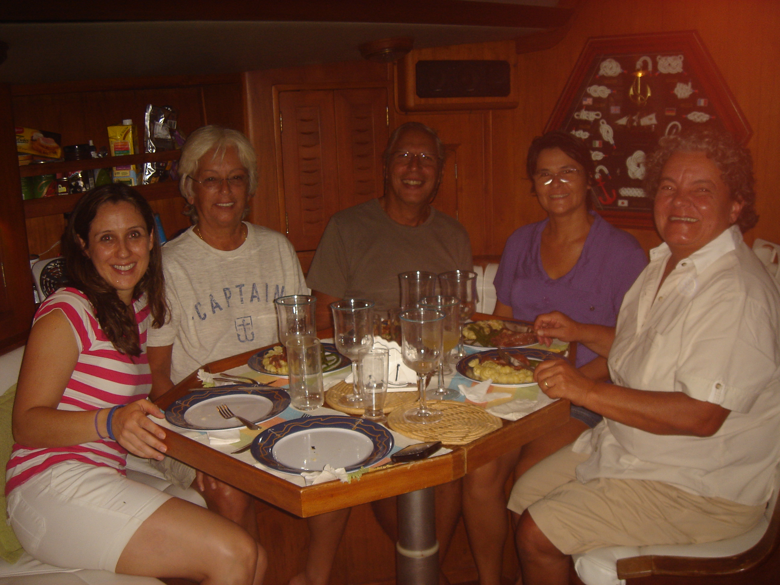 Hoje vamos jantar no Mare Mio (um lindo Beneteau de 45 pés) e levamos todos os perecíveis para a Roberta e Neila – tem bacalhau (que a Neila e Ricardo já experimentaram e adoraram), feijoadinha, frango ensopado, hambúrguer congelado (que eu mesma preparei), massa de pastel (que uso para fazer raviólis), palmito, azeitonas, etc. Os legumes e as uvas passas já demos para a Lucy – da traineira Sardinha – nossa amiga querida, com quem sempre passeamos de bote inflável até a prainha, para um banho de mar. Por falar em Lucy, noutro dia o Rufino, seu marido, nos presenteou com uma garoupa que ele mesmo pescou e preparamos um caldo – maravilha de peixe – saboreado até a última posta, incluindo a cabeça.