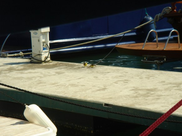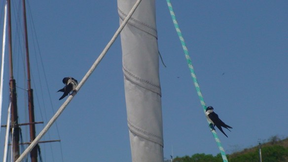 As andorinhas voltaram a querer fazer ninho dentro da nossa vela mestra. Todos os dias elas pousam nas escotas da genoa e ficam dando vôos rasantes em direção a abertura da vela junto ao mastro. Sempre que vemos, as espantamos, porque não queremos que elas percam outro ninho (noutro dia saímos e, ao levantar a vela mestra, caiu um ninho, por sorte sem ovos ou filhotes).