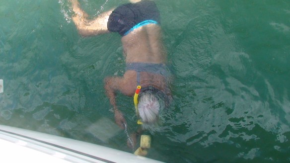 As águas de Parati são muito “férteis”, porque aquecidas e cristalinas, são propícias para a vida marinha. Assim, a cada mês, os cascos dos barcos devem ser limpos, independente da tinta envenenada estar nova ou não. As cracas do Bubi foram removidas há duas semanas (pelo marinheiro que contratamos), mas hoje a Vivi observou que as danadas já estão de volta. Resolveu, então, dar uma raspada, para a felicidade dos peixes que a seguiam para pegar as “sobras”.