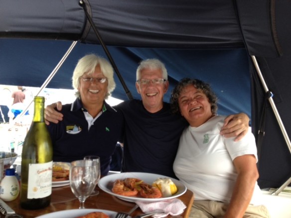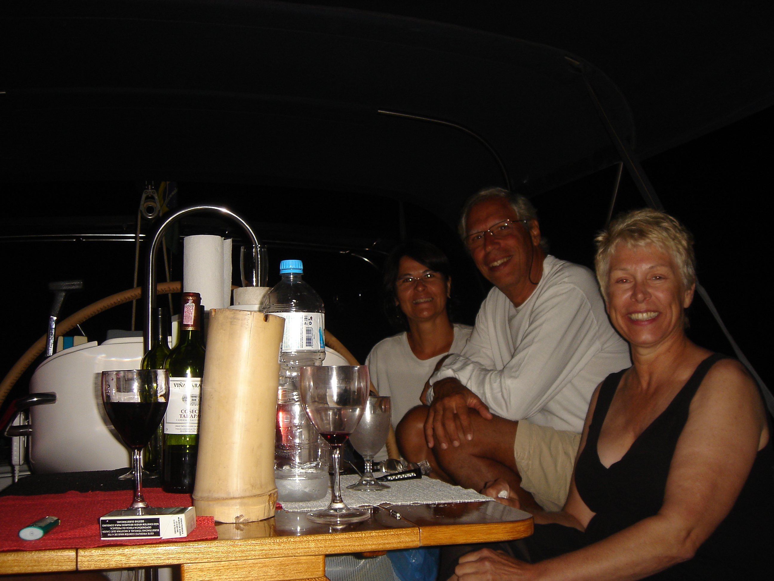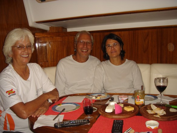 Já que chove, nada melhor do que um bom vinho e alguns queijos. Aqui com nossos amigos e vizinhos de pier – Ricardo e Neila (veleiro Iratembé).