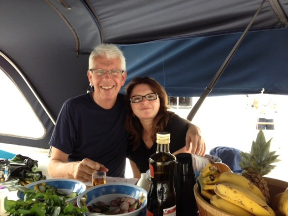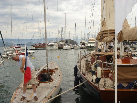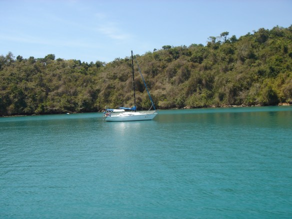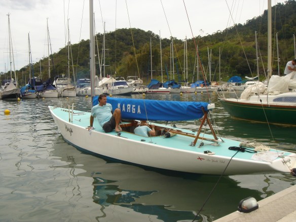 Depois Vivi vai dar uma cochilada e eu e Gelike ficamos no cock-pit jogando conversa fora, quando, já entardecendo, o velejador de um barco francês que vimos ancorar no começo da manhã, vem ao nosso encontro com seu inflável. Encosta no Bubi, segura-se no costado e puxa conversa, em frances. Gelike, que é poliglota, conversa com o marujo, mas em português me fala: “ainda bem que a Vivi está dormindo, senão iria convida-lo para jantar”… e cai na gargalhada.
