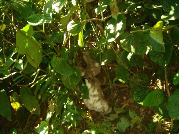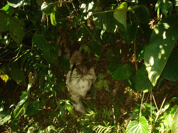 Na volta, descendo a serra que conduz à localidade, um carro a nossa frente sinalizou para pararmos, quando observamos algo caído sobre o asfalto. A  princípio nos assustamos, parecia uma criança atropelada. Descemos do carro de imediato e, para nossa grata surpresa, era um bicho preguiça atravessando a rua, com aquela lentidão que lhe é peculiar. Coisa mais querida, com aqueles olhinhos assustados, porque, a essas alturas, vários carros haviam parado e muitas pessoas estavam ao seu redor. Houve uma pequena discussão – como se pega? por onde se pega? por tráz, diz um dos presentes. Um rapaz segura o preguiça por sob os membros dianteiros, pelas costas, e vai recolocá-lo na mata, quando outro lhe grita: “não, ele estava indo na outra direção, tentando atravessar a pista”. De imediato o rapaz inverte seus passos e leva o pequeno grande (adulto) animal para a mata que beira a estrada, na direção em que ele preguiçosamente esfregava a barriga no asfalto na sua lenta (mas bota lenta nisso!) movimentação.