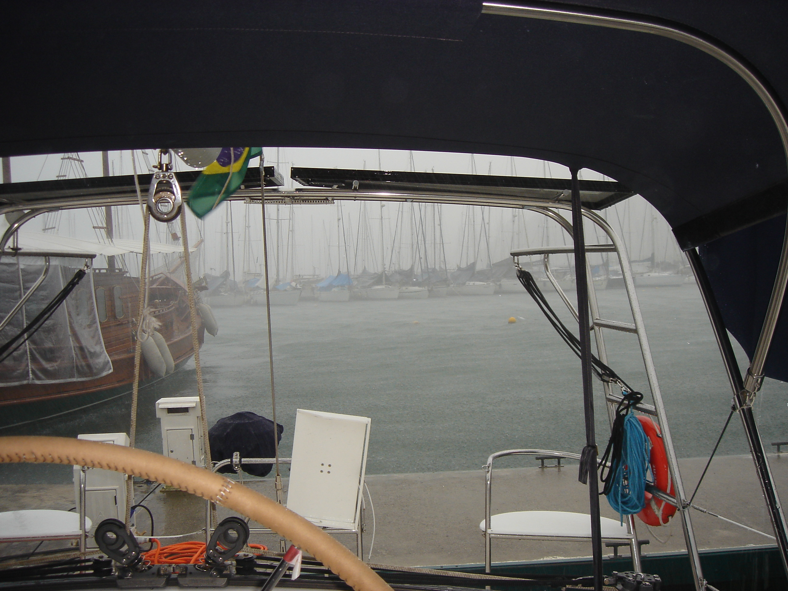 Semanada programada para a Ilha Grande abortada. A semana iniciou com ventania, nos acordando às cinco horas da manhã, fazendo parecer que o Bubi ia desgarrar do pier, tamanha a força do vento soprando de sudoeste (mais de 40 nós, presumo). Depois, ao longo de todo o dia, chuva, trovoadas, relâmpagos mil. Mas, a bordo, tudo é bom, até tempestades tropicais. Hoje já é quinta feira e os episódios de chuva continuam.