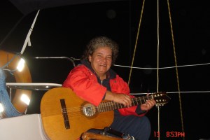 São vinte e duas horas, Vivi e eu estamos no cock-pit curtindo a lua e um violão, para não perder o costume. Mas o dia foi longo, estamos cansadas de tanto brincar, feito crianças, e resolvemos ir dormir.