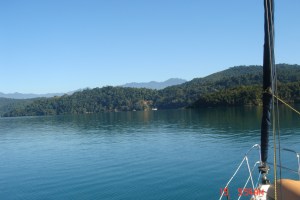 Amanheceu um dia intensamente nublado, com vento sul remexendo as águas daquela baía que não são abrigadas dele, quando resolvemos partir. A comandante Vivi falou: – vamos tomar café enquanto navegamos, ou ancoradas em um lugar abrigado, porque esse vento vai aumentar. Nos preparamos para recolher a âncora e o guincho elétrico resolveu patinar na catraca. Pega a manicaca, aperta, afrouxa, aperta outra vez e ele volta a funcionar bem. Não é a primeira vez que isso ocorre.