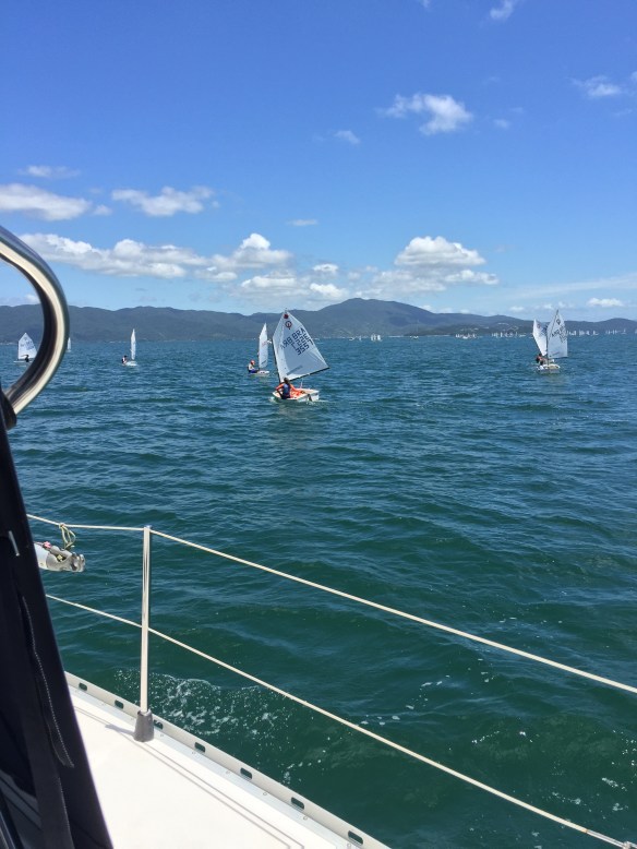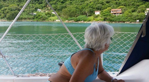 Ontem foi um dia espetacular. Ancoramos na Lagoinha – uma praia ao norte da Ilha de Santa Catarina. A água, apesar de gelada, estava de uma transparência indescritível e maravilhosa para banhos de mar. Na volta, o motor do Bubi apagou e tivemos que velejar de volta ao iateclube, com pouquíssimo vento. Mas foi muito divertido e sem estresse.