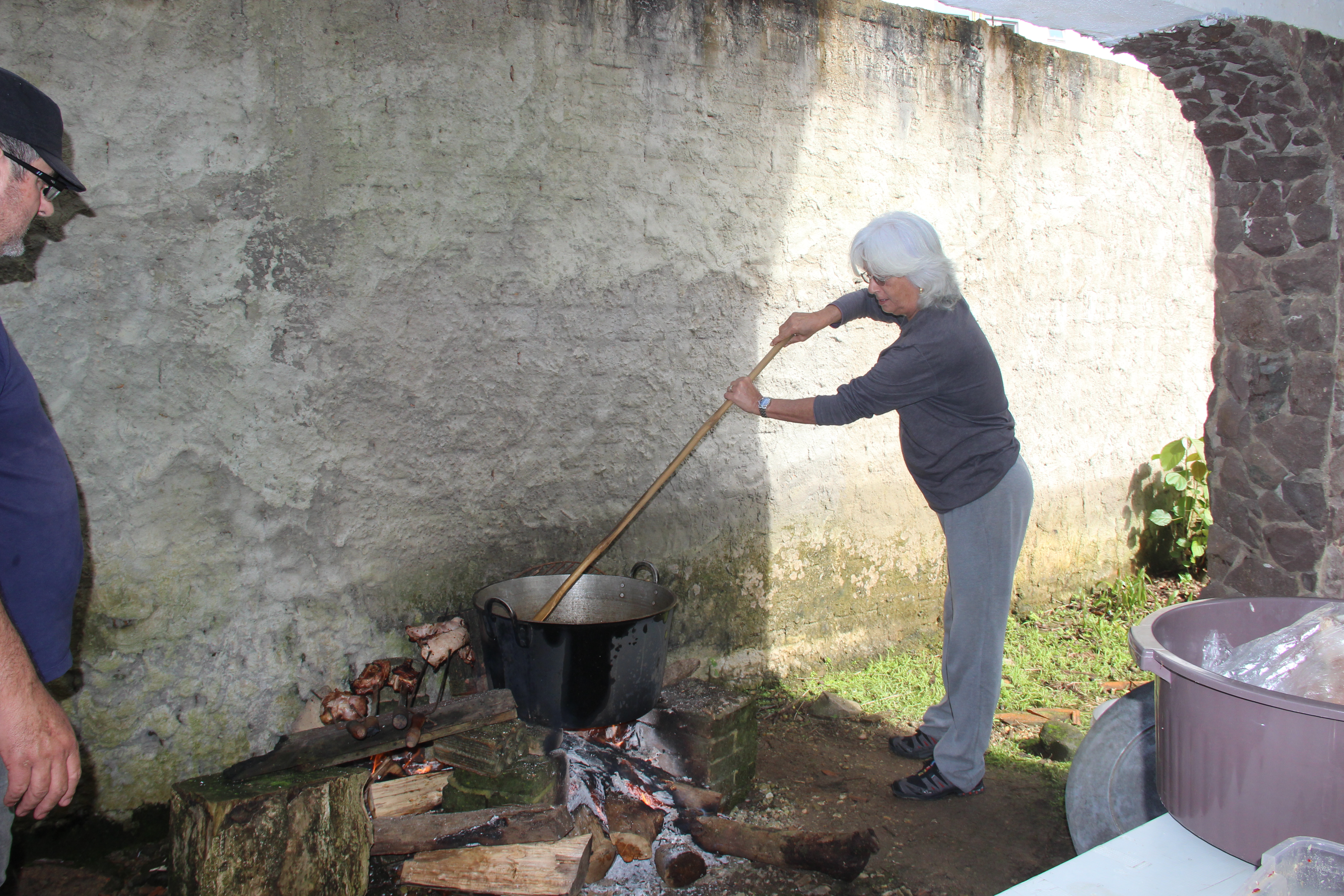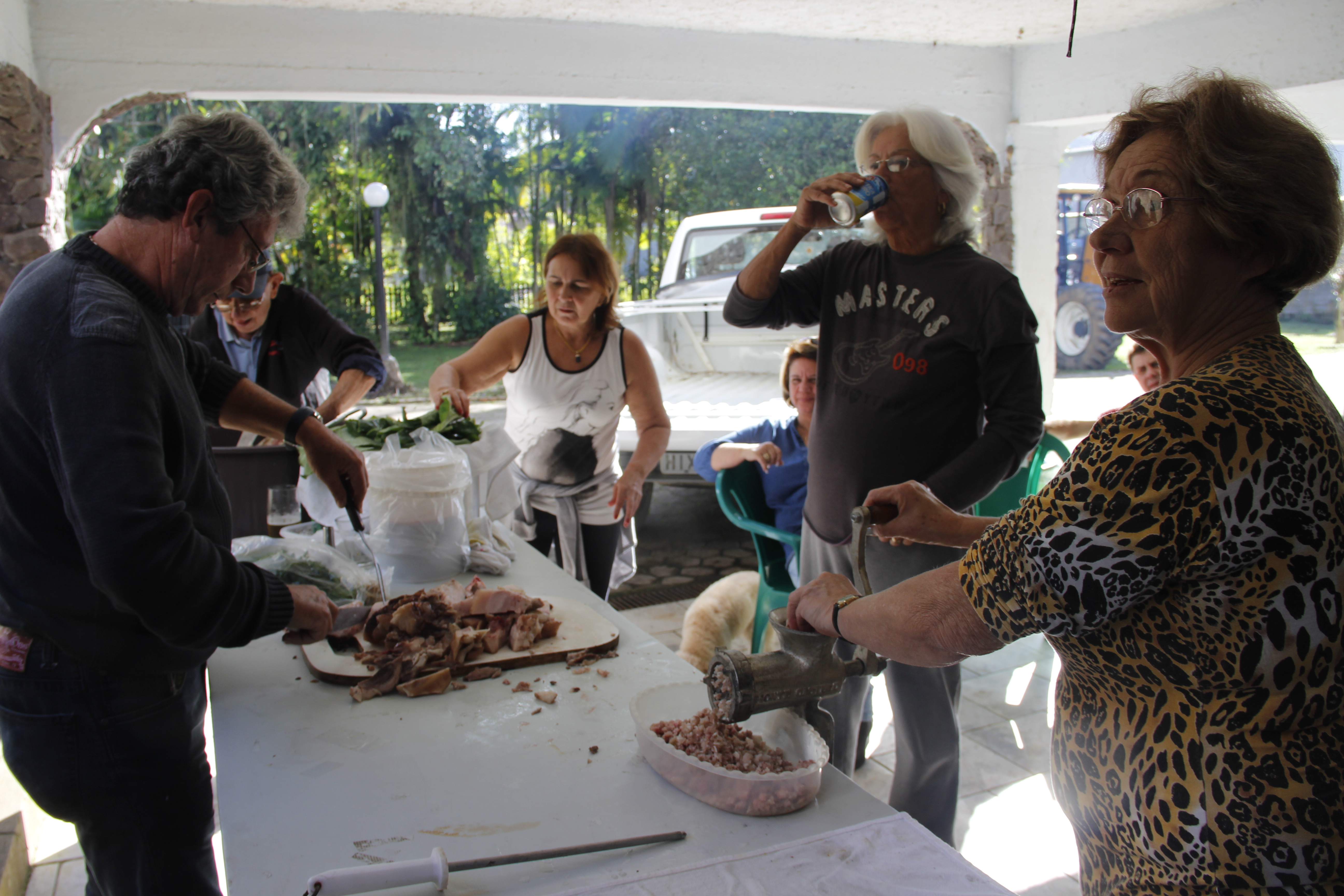 Em Blumenau, onde vamos com certa frequência, dessa vez fomos para um evento especial – ajudar a desossar e preparar um porco de 120Kg recém abatido. Só nos recusamos a ver o abate, porque é muito triste! Mas a festa foi boa, em casa de amigos queridos. Passamos o dia comendo porco sob vários preparos: torresmo, morcilha branca e preta, costela e pernil grelhados e, o mais especial de todos, a ferssura (como é chamado, naquela região, o preparo dos miúdos em molho com muita cebola, alho, pimenta e outros condimentos), elaborado pela querida e grande amiga de infância, Vera Becktold.