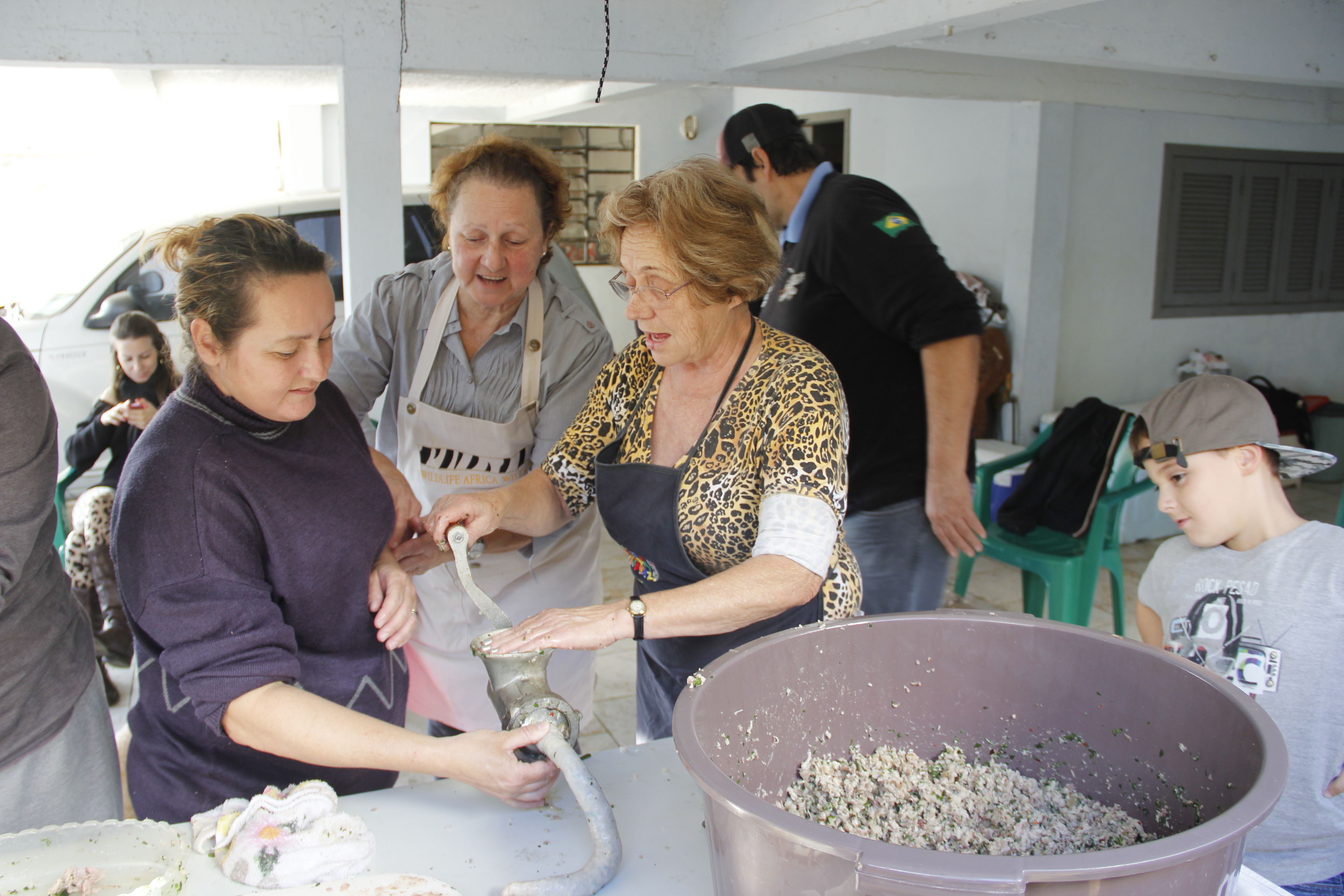 Desossando a cabeça do porco, um dos ingredientes da morcilha e já a processando numa máquina de moer.