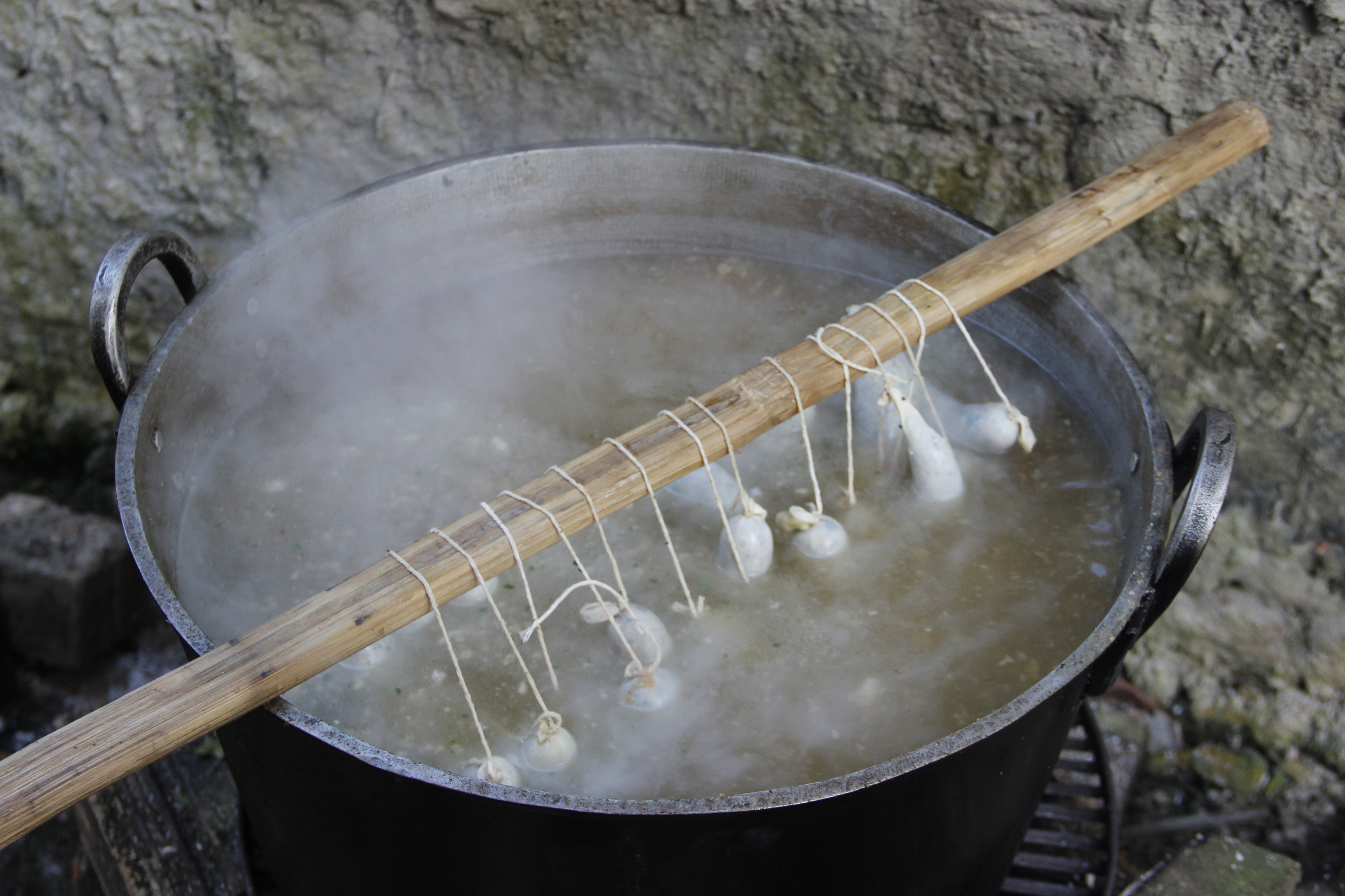 Morcilhas brancas cozinhando.