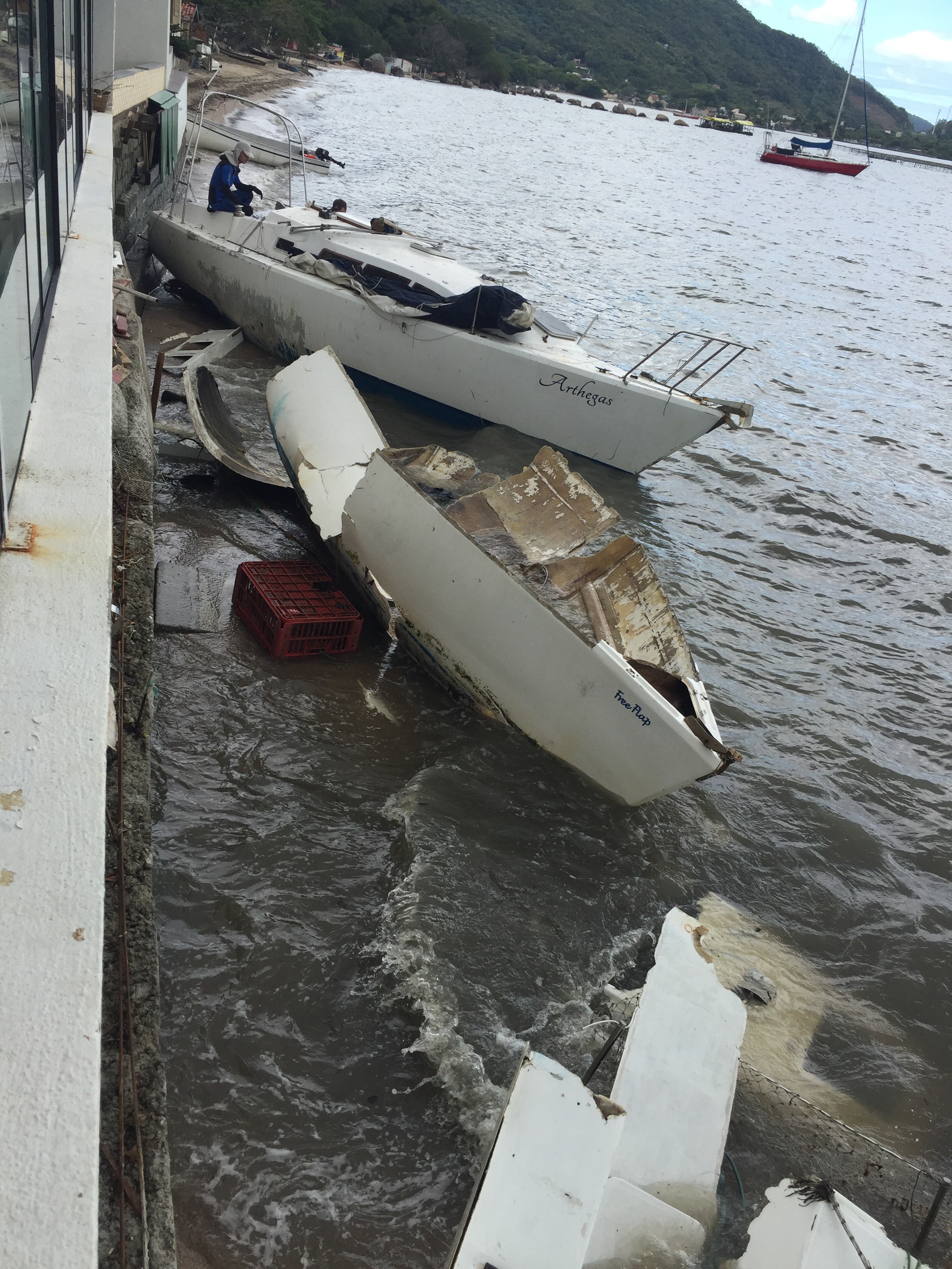 Abaixo algumas fotos da Marina de Santo Antônio de Lisboa (situada em Floripa), onde 10 veleiros foram para a terra – alguns com perda total.